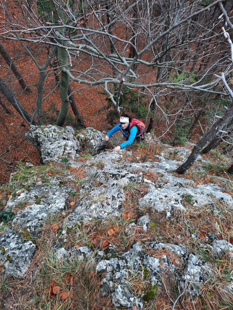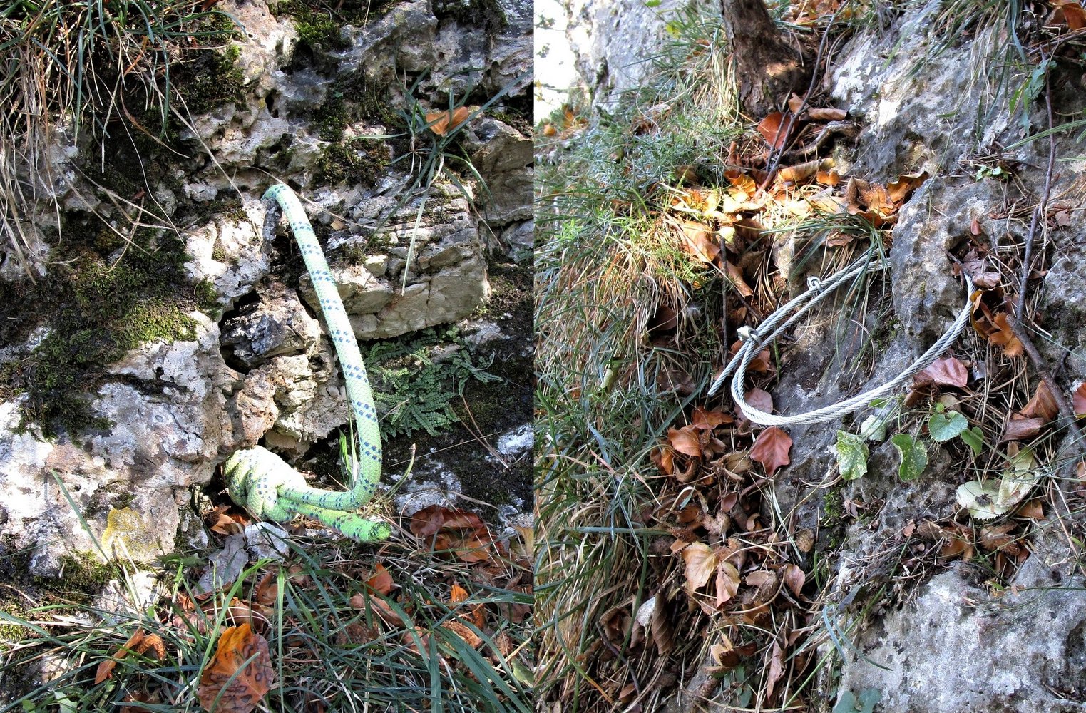 Die schwierigen Stellen sind mit fixen Sanduhrschlingen gut gesichert, dazwischen bieten sich viele Bäume für die Standplätze an. Die erste Seillänge ist etwas moosig und bei Nässe unangenehm.
