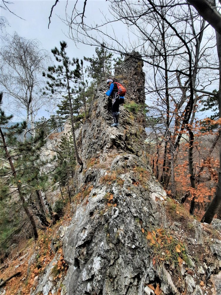 Am Fuß des Turmes rechts aufwärts, um die Kante und hinauf auf den ersten Turm (2). Am Grat entlang auf den zweiten Turm (2) und rechtshaltend hinunter in eine Scharte im Wald (2). Hier berührt man den Wanderweg. Rechts um den nächsten Felsaufbau herum gehen (links sieht man die Durchgangshöhle) und zur Wand mit dem Gratfenster. Steil hinauf zum Fenster (2 oder 3-), rechtshaltend auf den Grat (2) und oben luftig nach links (2-). Am Grat weiter, die Türmchen überschreiten (dritter Turm, Zackengrat) und plattig hinunter (1+) in eine Scharte. Steil und etwas brüchig auf den vierten Turm (2) und kurz bergab (1-). Von hier kann man wieder nach links zum Wanderweg gelangen. Am Rücken im Wald auf Steigspuren weiter, zuletzt unter einer neckischen Felsschuppe zur Ruine am höchsten Punkt.