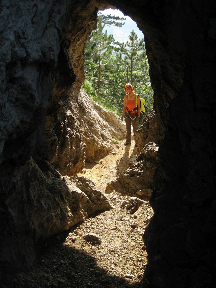 Kletterausrüstung, 4 Exsspress und Helm. Geübte gehen die Tour auch gerne seilfrei.