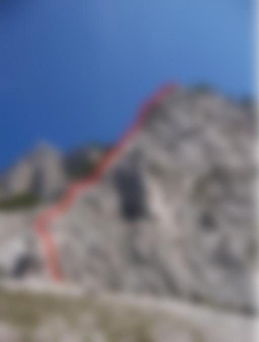 Vom letzten Stand einige Meter aufwärts auf ebene, bewaldete Wiese. Kurz nach links zum Felsenfenster. Durch dieses absteigen (evtl. am BH abseilen). Am Ende des Felsenfensters sofort nach rechts um die Kante (I-II) und kurz auf die Waldkuppe ansteigen. Von dort brüchige Schrofe (I-II) abklettern, danach taleinwärts queren und wieder abklettern Richtung Schuttrinne. Zuletzt über Geröll zurück zum Einstieg. Die gelben Markierungen beim Abstieg sind schon sehr ausgebleicht. Trittsicherheit erforderlich!