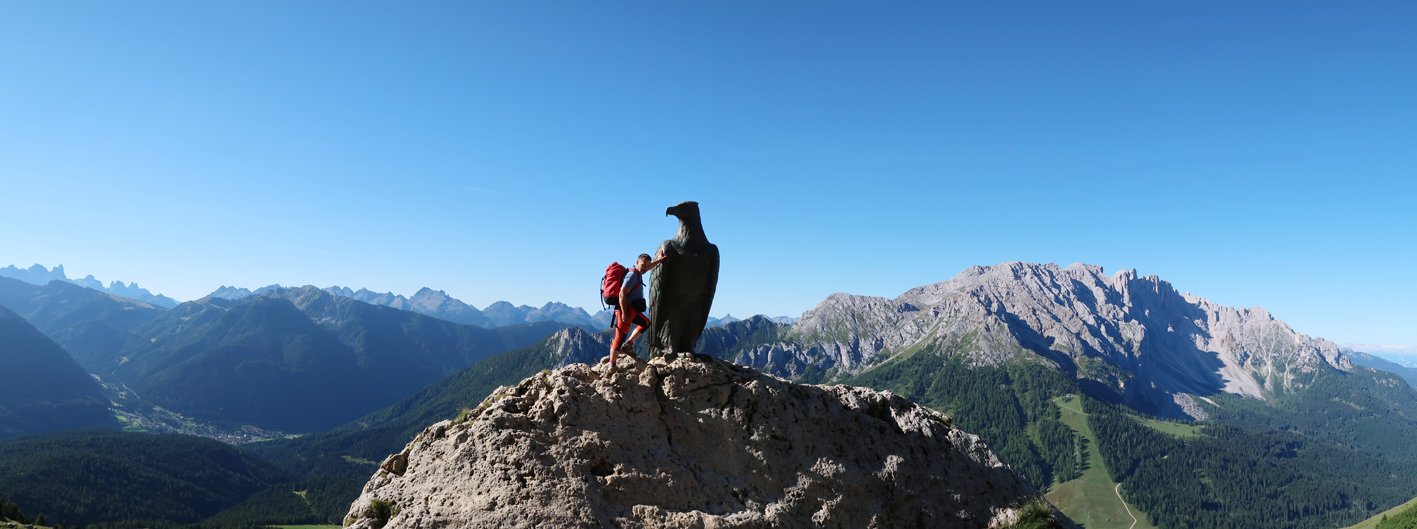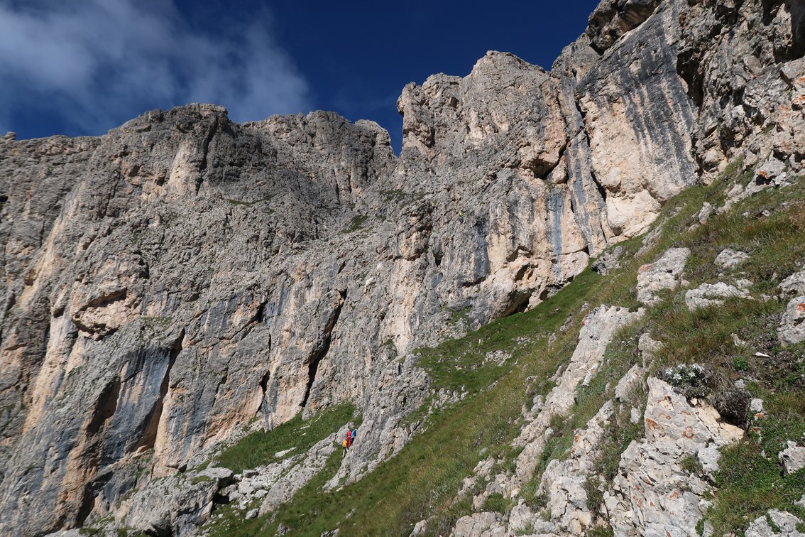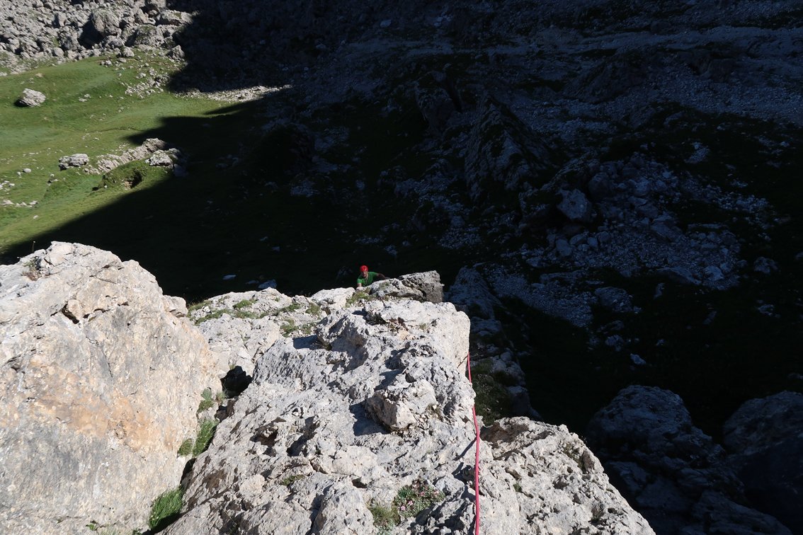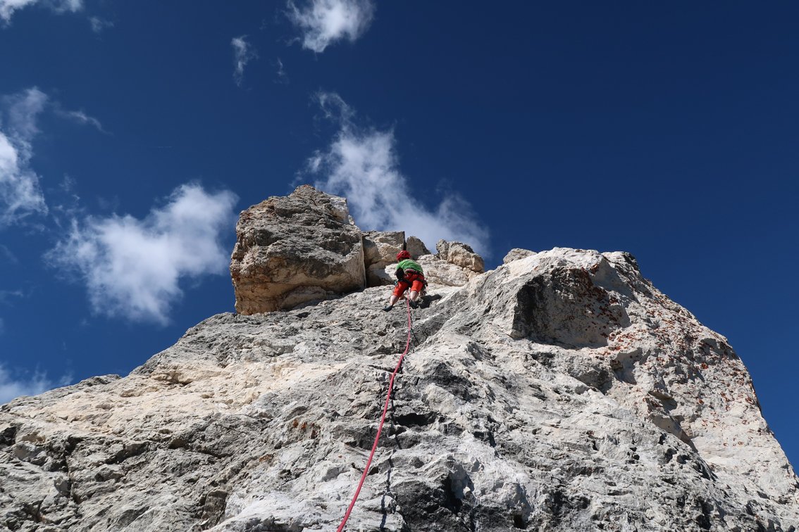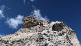 Obwohl der berühmte "Rüssel" im Gipfelbereich ins Tal gestürzt ist die Südkante immer noch ein oft begangener Dolomitenklassiker, der schöne Genusskletterei bietet. Highlight ist die luftige Abseilfahrt direkt über das Felsenfenster (Fensterl), dabei ist man immer im Blickfeld der meist zahlreichen Rotwandklettersteiggeher.