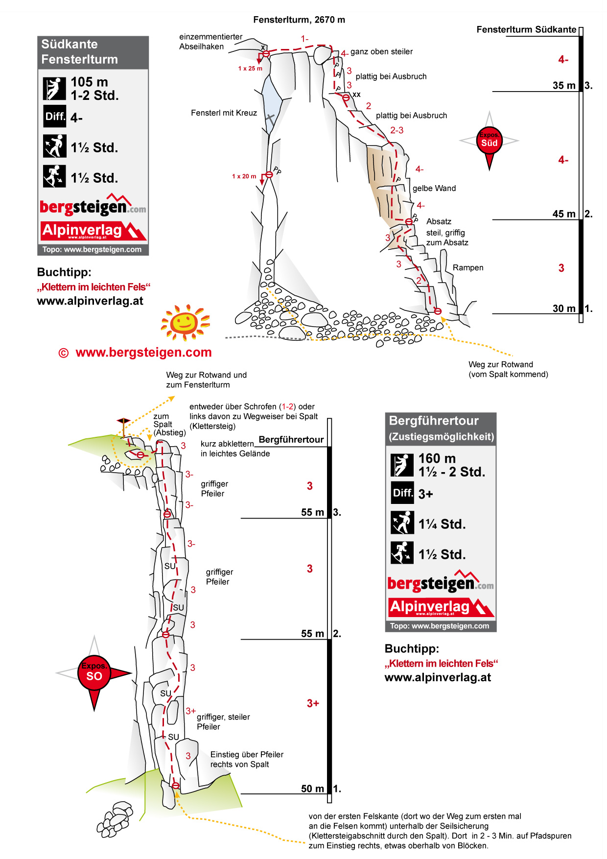 Fensterlturm Südkante (105 m, 4-): Zuerst flach, dann steil zu einem Absatz an der Kante. Dann weiterhin steil über die "Gelbe Wand" hinauf auf den flachen Grat. Im Ausbruchbereich des ehemaligen "Rüssels" zu Standplatz an Bohrhaken. Entlang des Grates hinauf auf den Gipfel zum Abseilstand oberhalb des Fensterls.
