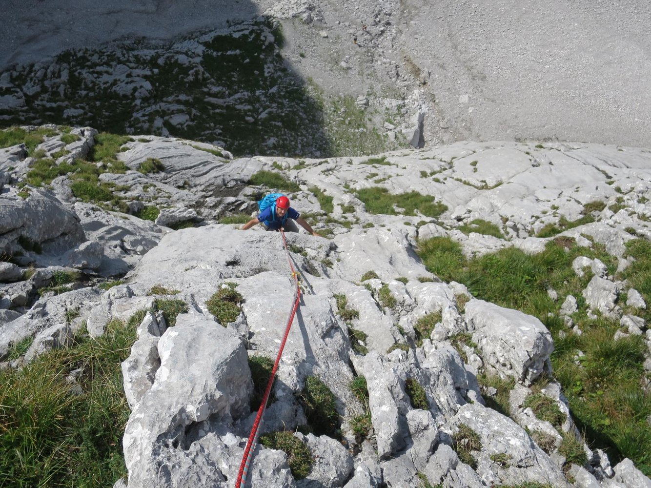 Abseilen über die Route mit Doppelseil ist möglich. Oder orografisch links absteigen (über den einzelnen Baum!) zum Wandfuß, Kletterstellen bis 2-.