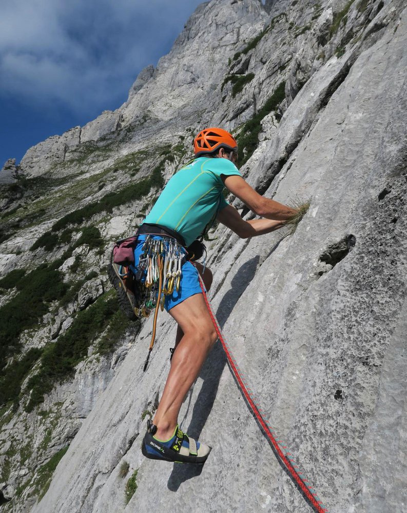 Kletterausrüstung mit Helm, ev. ein Satz Friends und Sanduhrschlingen.