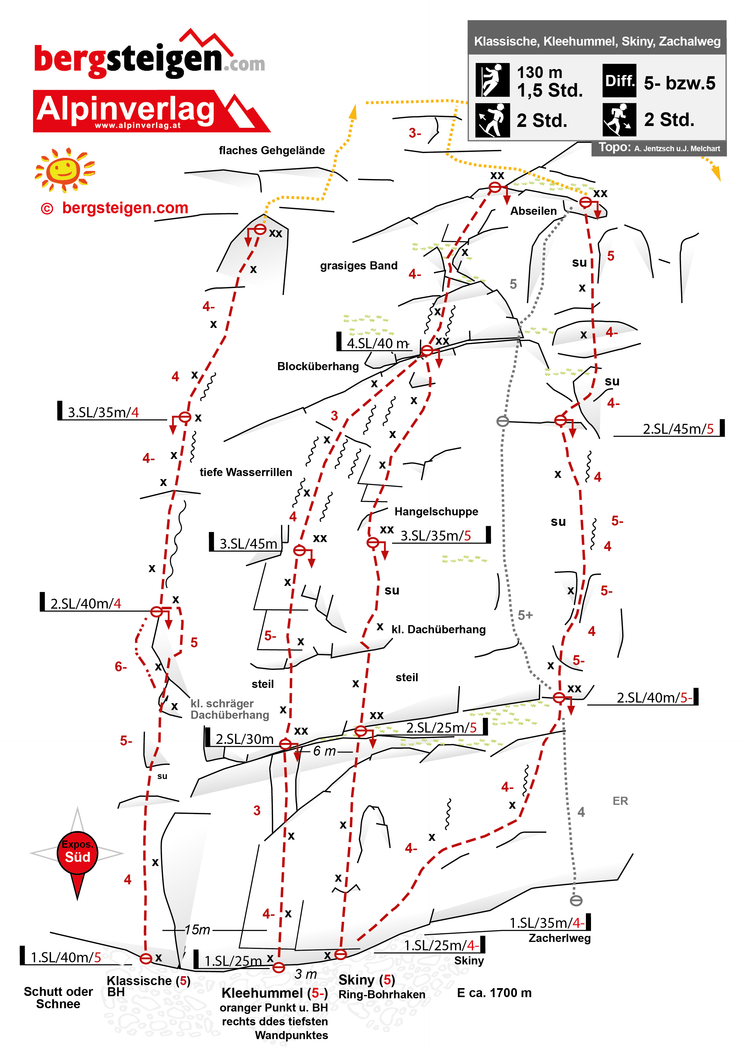 Interessante Tour am Festkogel Vorbau. Bei der Crux zu Beginn der 2. Seillänge gibt es eine Bohrhakensicherung, sonst wie am Vorbau gewohnt sehr weite Abstände. Die Tour kann gut als „Zustieg“ zur Festkogel-Südwestwand oder als eigenständige Kurzkletterei gemacht werden.