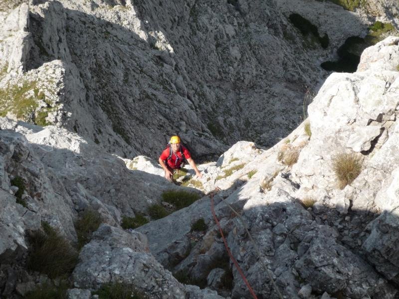 a) Über die Absteilpiste (6x25) durch die Südwand zurück. Der Beginn ist wenige Meter östl. des Gipfels bei zwei Bergrettungshaken mit rotem Pfeil.