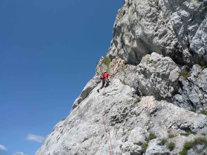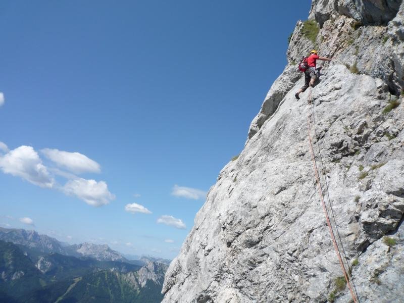 Landschaftlich und auch Klettertechnisch sehr schöne Überschreitung des Kl. und Gr. Festlbeilsteins über die Westkanten. Die Tour ist nur an den Standplätzen mit BHs versehen, dazwischen stecken alte Normalhaken. Keile und Friends nur bedingt einsetzbar. Landschaftlich ist die Tour top und gewährt ständig einen großartigen Ausblick auf Stangenwand, Wetzsteinplatten und Hochschwab Südwand.