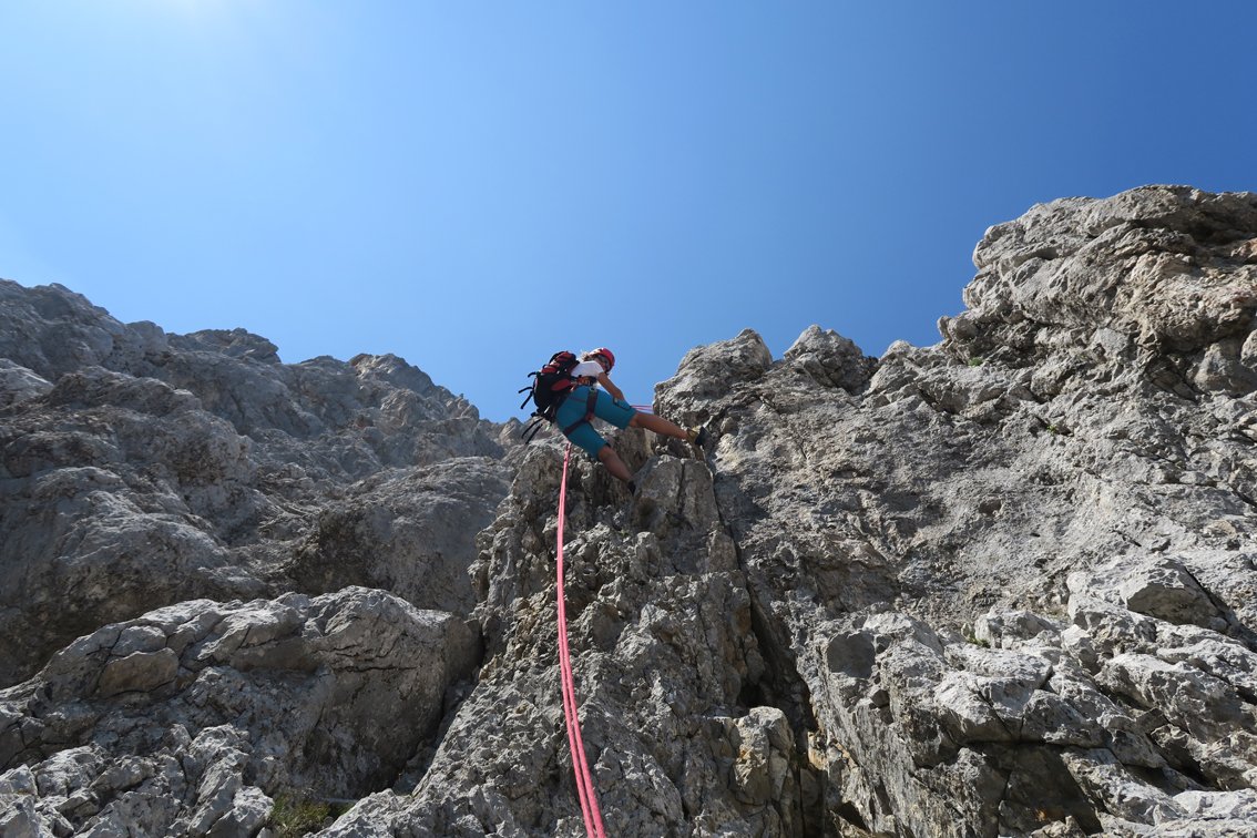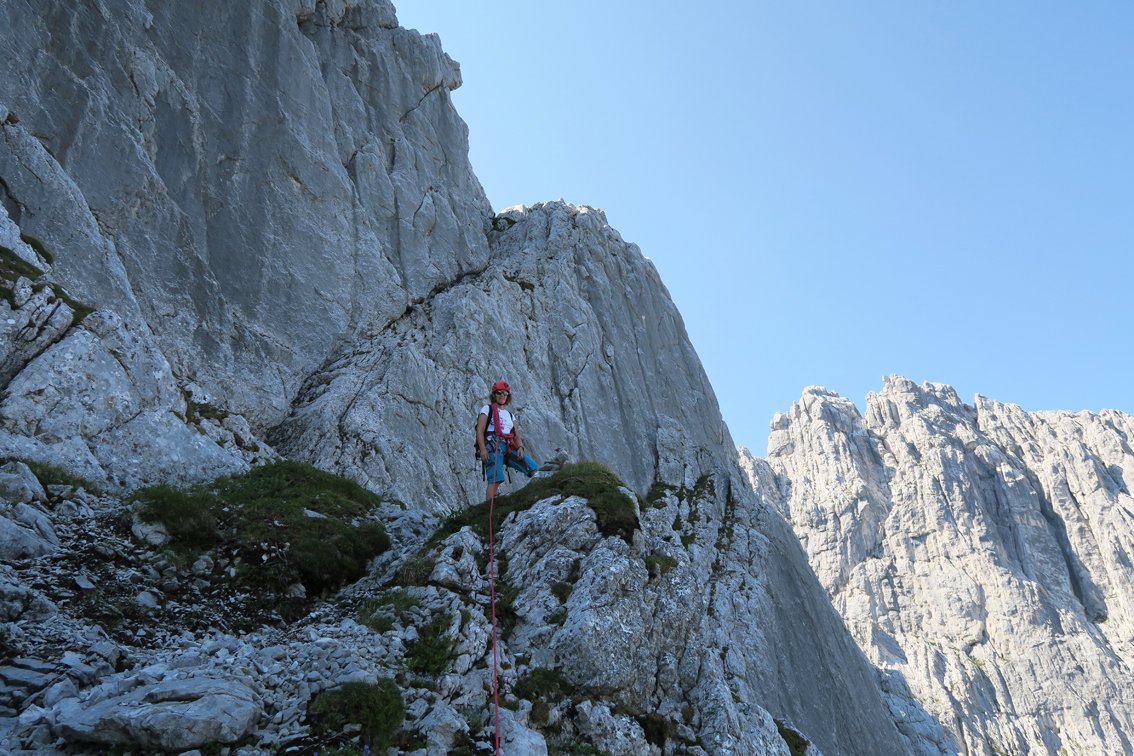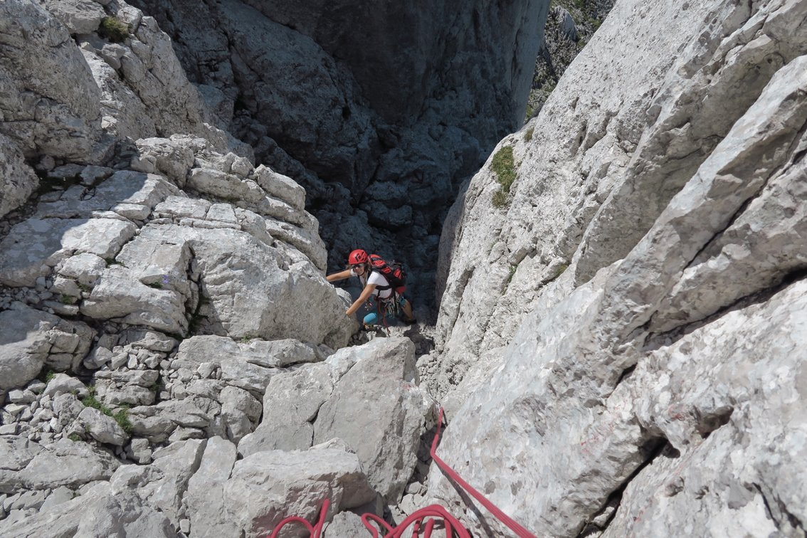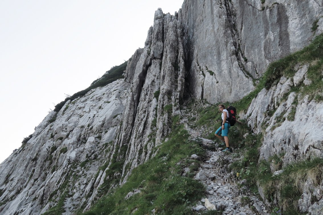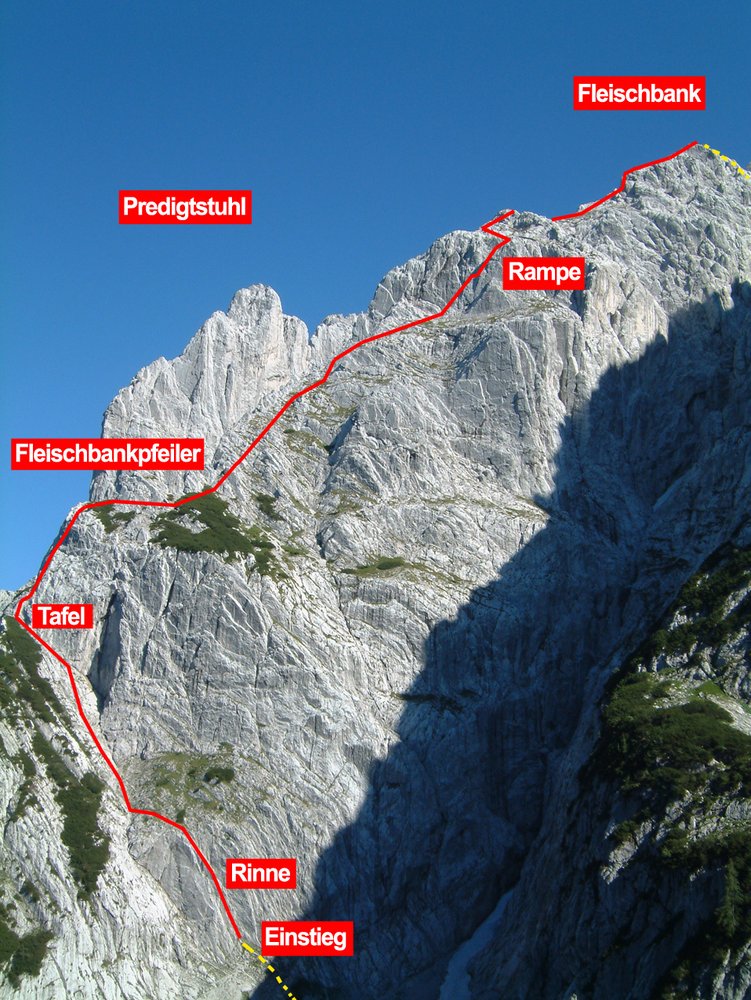 Durch eine Kaminrinne ca. 55 m empor (unten 2, kurz vor dem Ausstieg 3/3+, oben alte Haken) bis auf einen Absatz. Dort weiter entlang von Steigspuren aufwärts bis kurz vor die Gratkante (1-2, Schotter und Platten). Bei einer Gedenktafel direkt über eine Wandstelle hinauf (Normalhaken, 3+), dann immer im Bereich des Grates weiter (Stellen 3) bis das Gelände leichter wird. Man folgt den Steigspuren ca. 500 m bis zu einer großen Wandstufe (rote Markierung). Diese wird eher rechts über eine Rampe (2 x 40 m, 2) überklettert. Danach wird das Gelände wieder leichter, man folgt den Spuren und der roten Markierung hinauf zum Grat. Über Türme und Stufen (Stellen 3) bis unter den Gipfelgrat und dort direkt hinauf zum Gipfelkreuz (3-).