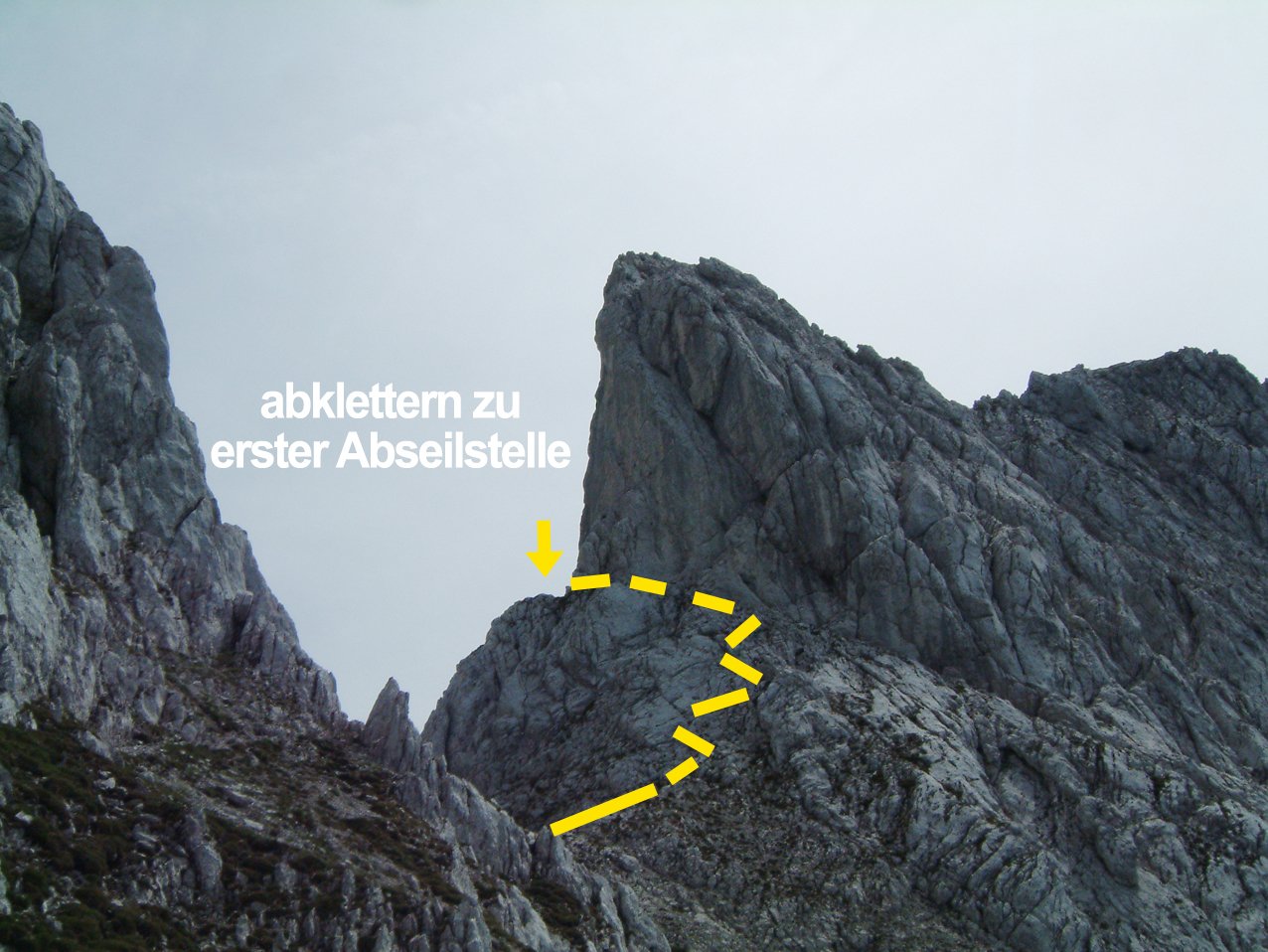 Vom Gipfel südwestllich durch ein Rinnensystem hinab (rote Markierung, Abseilhaken, Kletterpassagen bis 2) und den Steigspuren zur Christaturmscharte folgen. Dort nicht hinunter sondern entlang der roten Markierung aufsteigend rechts und linkshaltend auf ein Band am Beginn des NO-Grates der Hinteren Karlspitze. Auf deutlichen Trittspuren (1-2, rot markiert) in südlicher Richtung abwärts bis zur ersten Abseilstelle. Dort fünf mal (60 m Einfachseil, bei der Teilung nimmt man die Abseilpiste in die Schlucht, Abseilpiste ist rot markiert) bis auf den Schuttboden im Nahbereich des Ellmauer Tors abseilen (Vorsicht Steinschlaggefahr). Dann auf dem Eggersteig zum Wildanger bzw. zur Griesner Alm zurück.