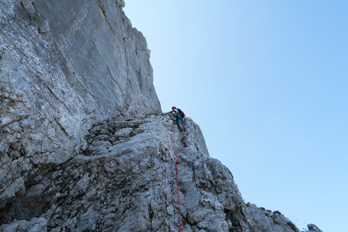Stände oft gebohrt, div. Bergrettungshaken auf dem Grat und dazwischen auch alte Normalhaken.
