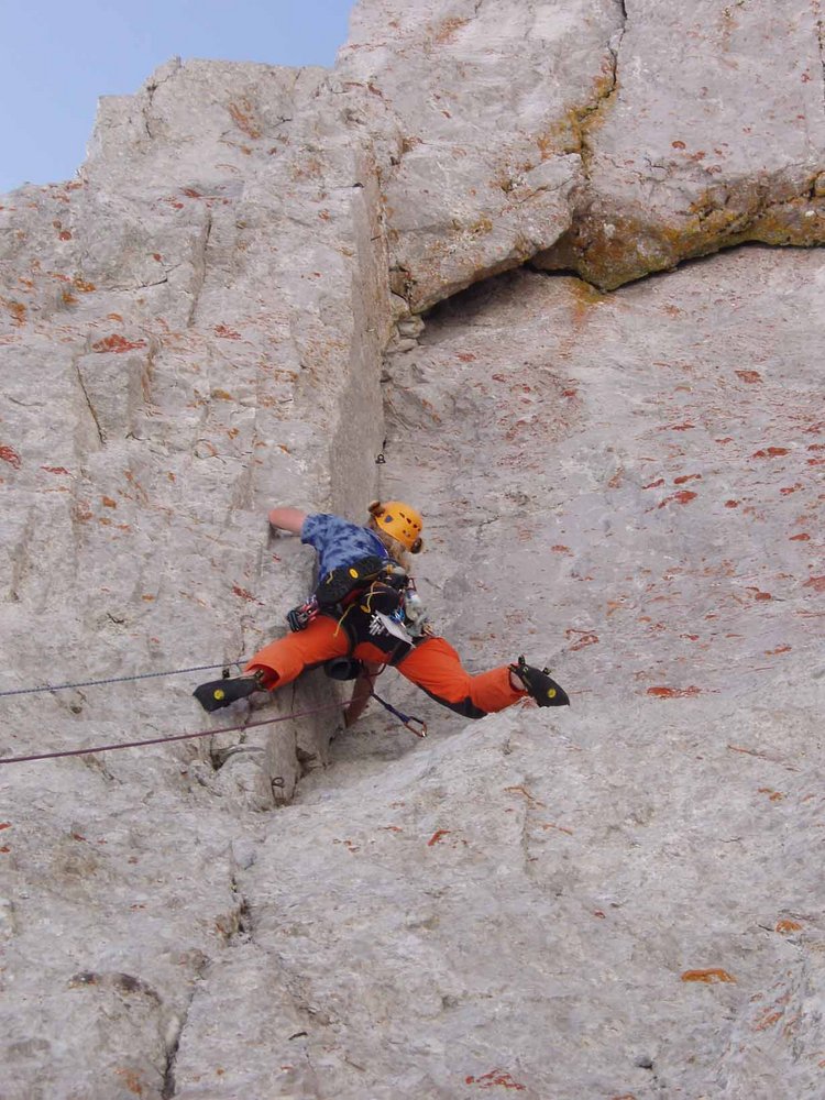 Die Sonne verschwindet so um 13.30, dann hat man die etwas einfacheren Längen vielleicht hinter sich und es herrschen im Sommer optimale Bedingungen. Die Normalhaken sind nur z.T. schlecht: in der berühmten Verschneidungsseillänge sind sie sogar erstaunlich gut.