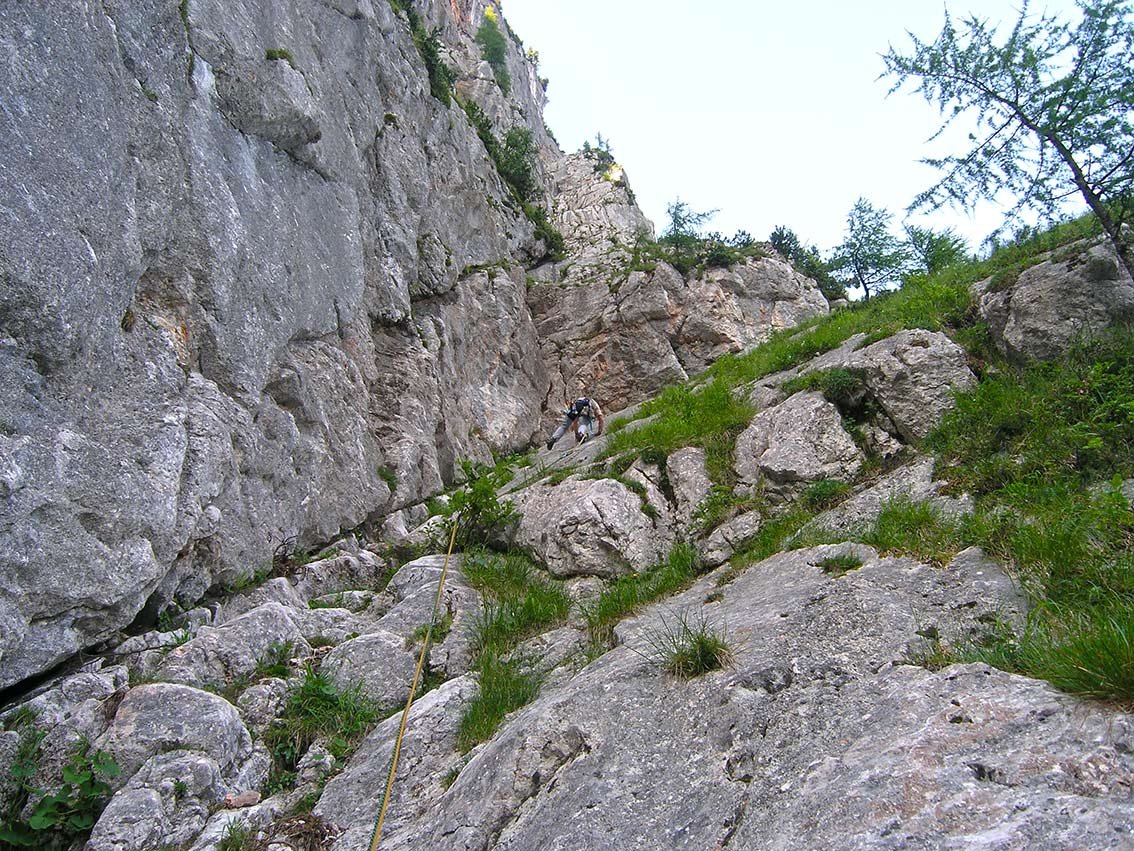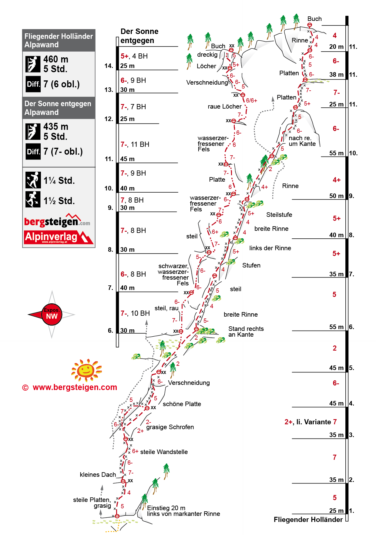 Die Route ist gut gesichert - im leichten Gelände aber schon mal ein weiter Abstand (3er/4er Schroffen sollten sicher geklettert werden). Ab dem Band in Wandmitte ist die neue Tour "Der Sonne entgegen" (siehe Topo) sicher die lohnendere Wahl, die grasige Seillängen vom Holländer werden so ausgelassen.