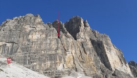 In der Rinne entweder links in die Verschneidung (meist nass) oder rechts brüchig (1 Haken) bis man im Schutt ankommt. Ab hier aufpassen auf starken Steinschlag!! Danach immer linkshaltend in der Rinne stellen bis III , ca 250meter bis zum Nordgrat. Diesen hoch zum Gipfel.