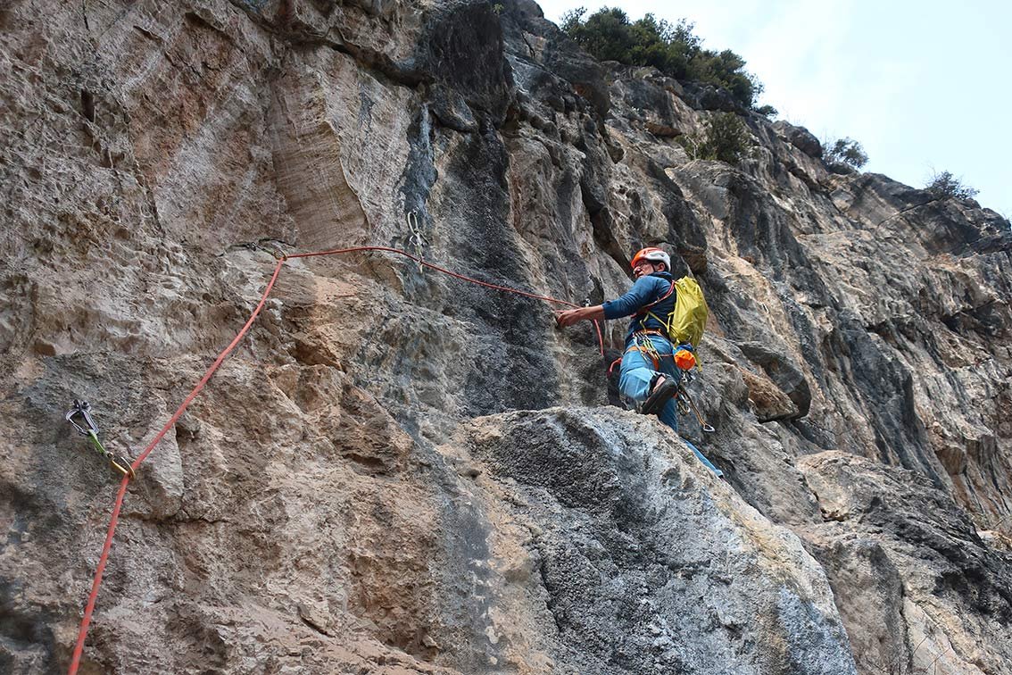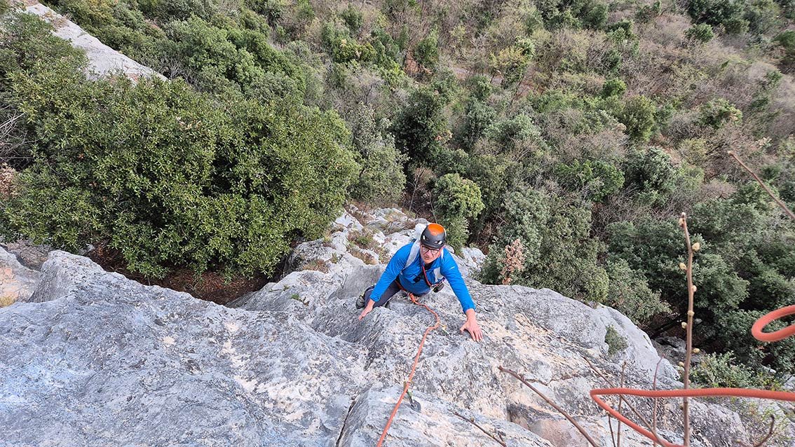RS1 Die Tour ist gut mit Bohrhaken ausgestattet, nur die letzte, einfache Seillänge ist etwas rustikaler (Sanduhren, geklebte Klemmkeile) gesichert.