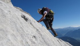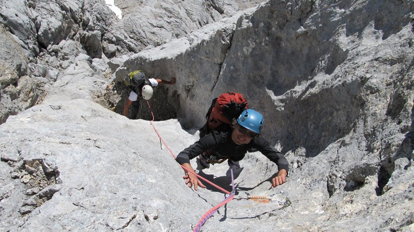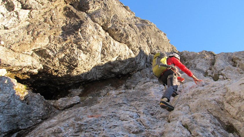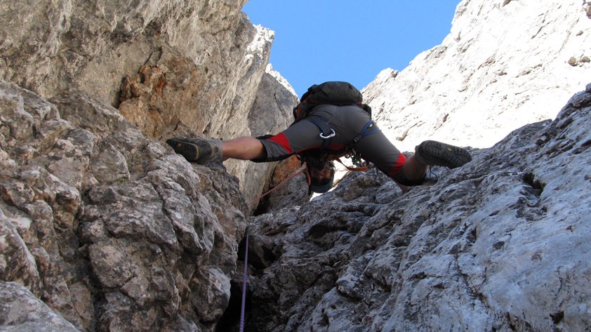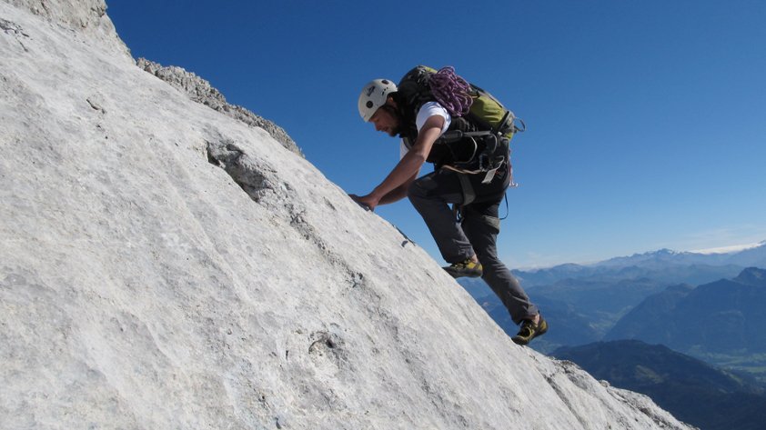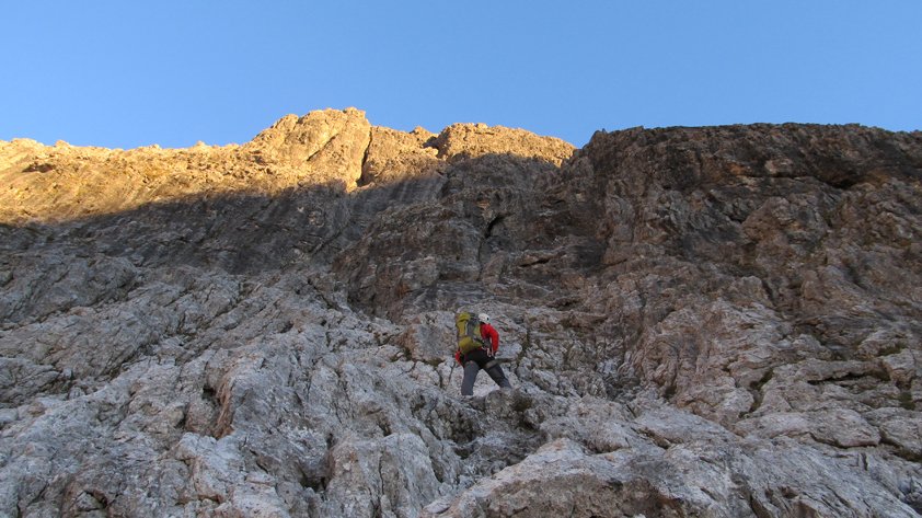 Lange, alpine Klettertour bei der man sinnvoller Weise die ganz leichten Passagen seilfrei klettert. Nur bei stabilem Hochdruckwetter in die Südwand einsteigen - heiße Sommertage sind aber auch nicht ideal (Südwand....).