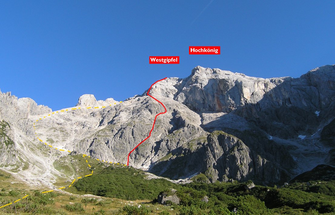 Zuerst dem Forstweg zur Stegmoosalm folgen, nach der Alm weiter auf dem Birgkarsteig in Richtung Hochkönig. Auf ca. 1900 m (siehe GPS-Track, kurz vor dem sog. Frühstücksteins) zweigt man bei einem Schild "Jubiläumsweg" rechts vom Weg ab. Man quert/steigt zu einer Schuttrinne (oft Altschneefeld) und weiter zu hellem, plattigem Fels auf. Der Einstieg ist bei Bohrhaken und roter Aufschrift unterhalb der Rampen/Rinne.