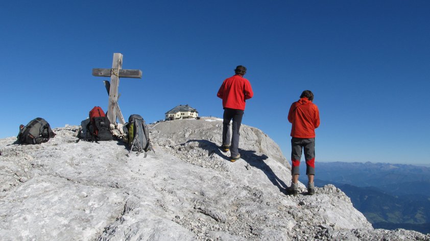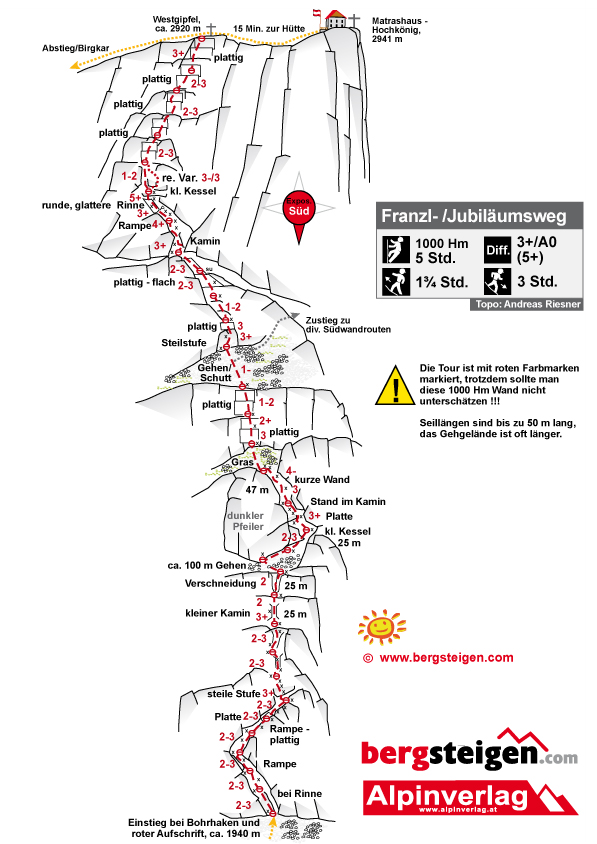 Die mächtige Höchkönig Südwand ist eine der großen Felsabbrüche in den Berchtesgadener Alpen. Viele schwere Klettertouren ziehen vor allem im rechten, senkrechten Wandteil direkt zum Gipfel hinauf. Im linken, flacheren Wandteil wurde von Richard Franzl der Jubiläumsweg, von vielen aber einfach Franzlweg genannt, erschlossen. Richard Franzl setzte neben soliden Bohrhaken auch dezent Farbpunkte ein, somit ist die Orientierung etwas einfacher. Dieser gewaltige Kletteranstieg ist Top - sollte aber nicht unterschätzt werden und ist eine perfekte Tagestour für konditionsstarke Alpinisten!