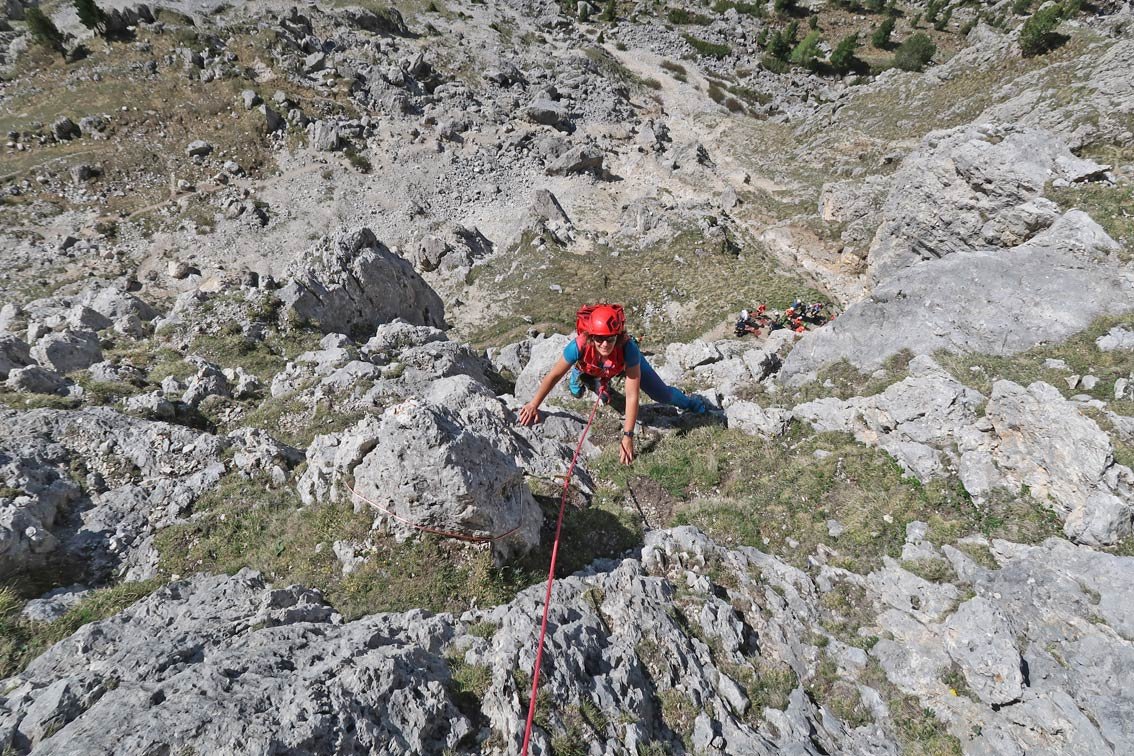 Vom Ende der Tour kann man entweder gleich 25 Meter rechts davon in eine Schlucht abseilen und auf Pfadspuren zur letzten Felsstufe (großer Steinmann). Oder man steigt weiter hinauf zum Gipfel des Ersten Sellaturms und geht von dort entlang des Normalweges hinunter (Pfadspuren, Stellen 2) bis zur letzten Felsstufe (großer Steinmann). Dort zwei Möglichkeiten: 1. Von oben gesehen nach rechts zu Abseilstelle (kurz 2) und von dort 25 m zum Boden abseilen. 2. Von oben gesehen links zu einer Rinne, diese abklettern (2) und unten über eine kurze Stufe (3) zum Wandfuß klettern. Der Abstieg ist stark abgeklettert, wenn man etwas schaut, findet man das gut. Vom Wandfuß auf dem Pfad zurück zum Sella Pass.