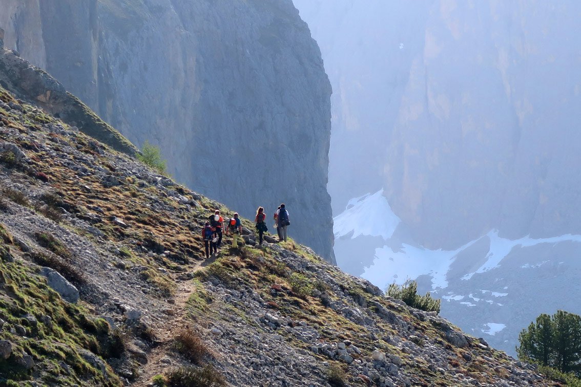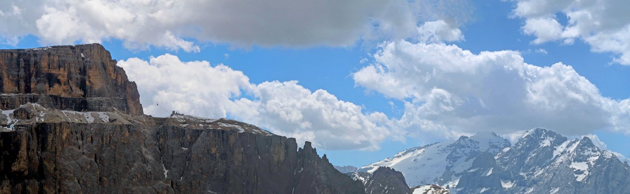 Auf der Brennerautobahn nach Klausen und dort weiter nach Gröden. Von dort hinauf auf den Sella Pass - auf der Passhöhe parken. Öffis: Mit der Bahn nach Klausen und mit dem Bus zum Sella Pass.