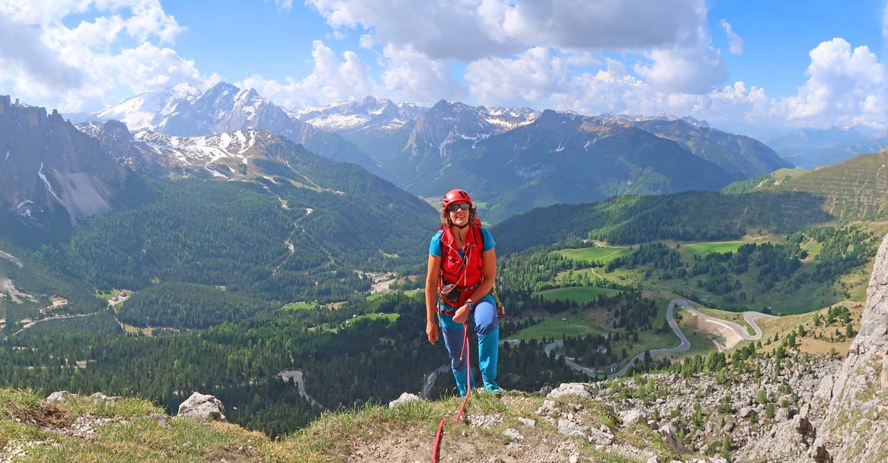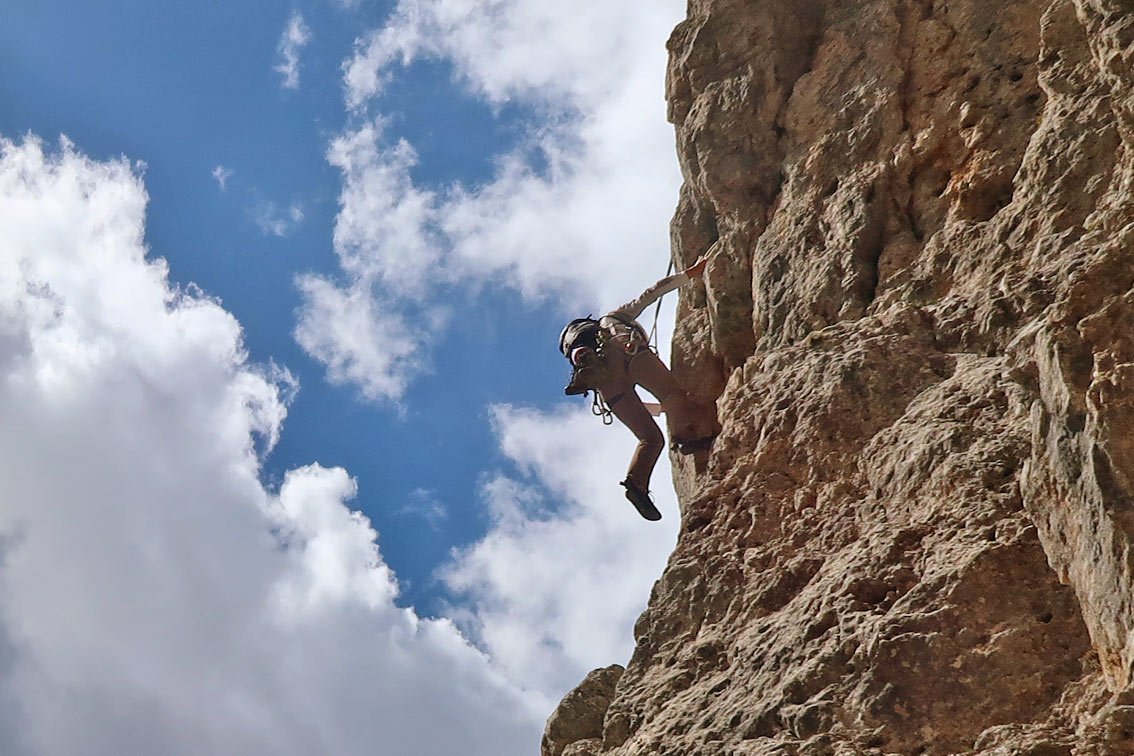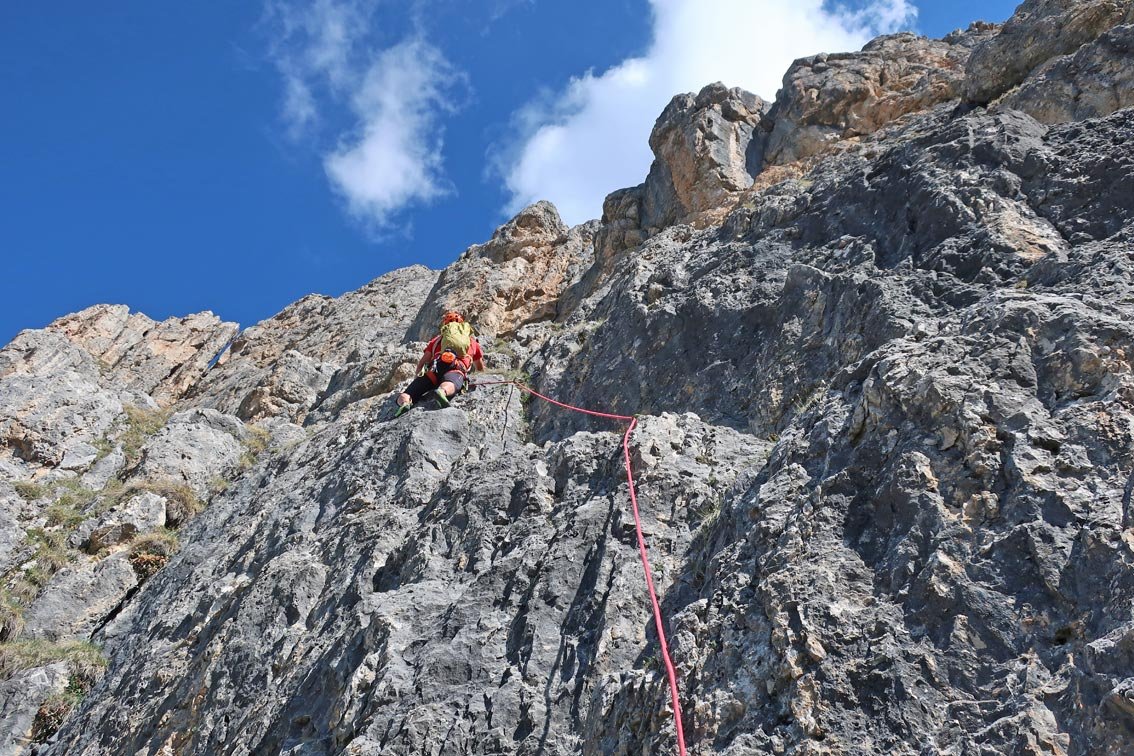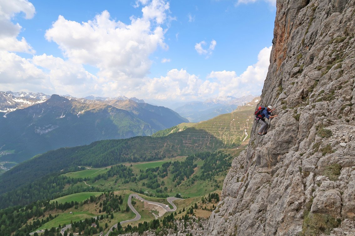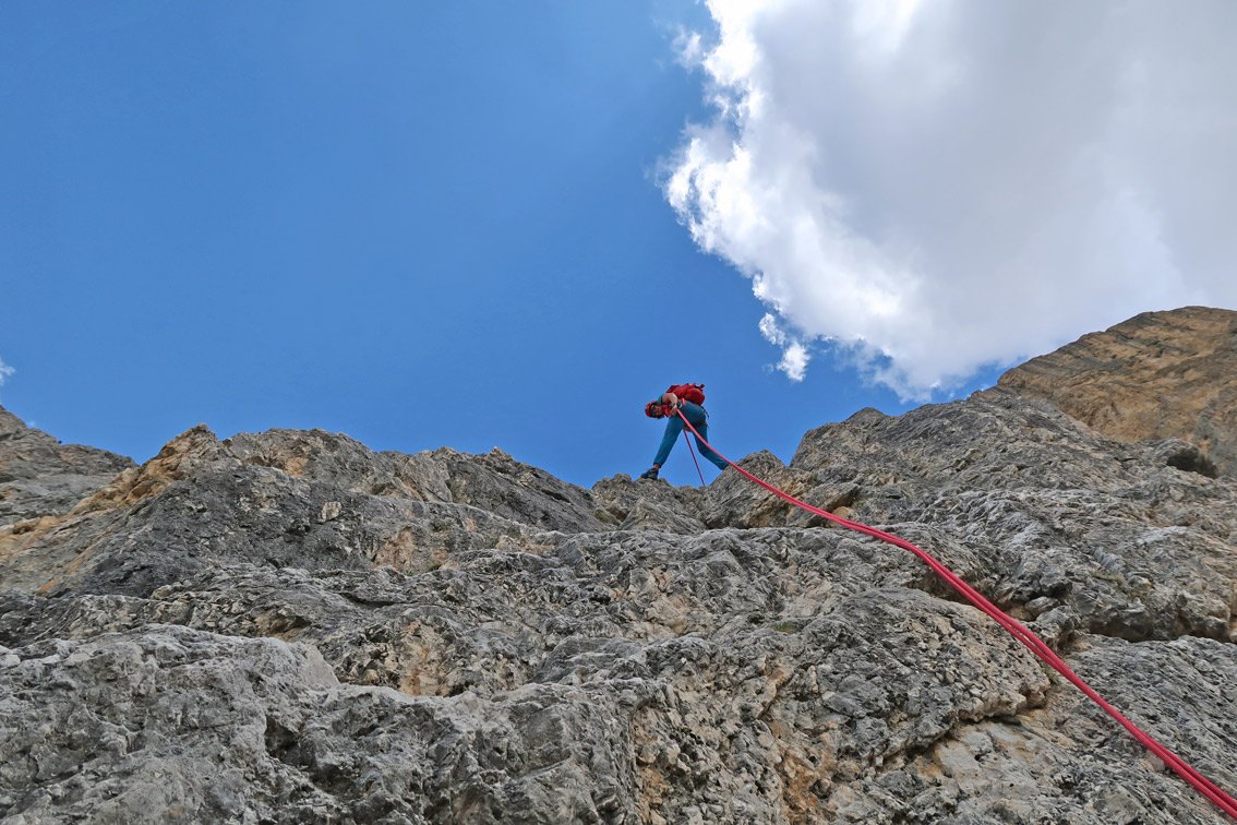 Freccia bis ist eine Routenkreation rechts der beliebten Route Freccia an der Südostwand des ersten Sellaturmes. Die Route hat einen steilen Beginn und deutlich mehr vertikalen Fels als die Freccia-Führe links davon. In der Mitte kommen die Routen zusammen – viele Freccia Kletterer klettern dann die letzten beiden Seillängen der Route Freccia bis über den tollen, steilen Pfeiler zum Ausstieg. Schöne, für Dolomiten-Verhältnisse auch recht gut gesicherte Tour am ersten Sellaturm – ein Tipp, wenn mal die Wetterverhältnisse nicht so stabil sind.