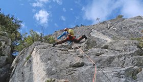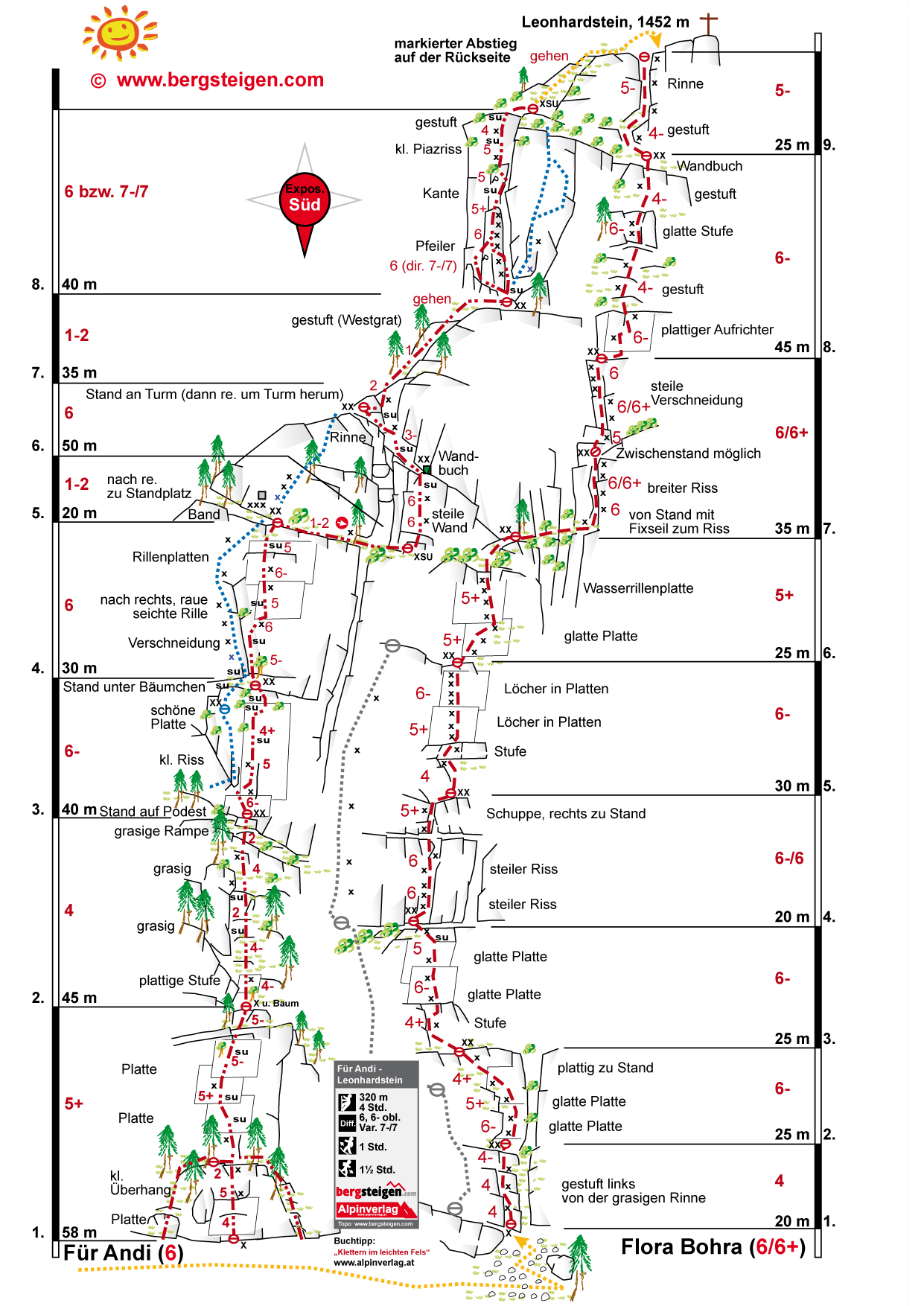 Schöne, lange und leichte Tour an der Südwand des Leonhardsteins. Unten ein paar grasige Passagen, dafür im oberen Teil sehr schöner, perfekt griffiger Fels. Die letzte Seillänge ist - je nachdem wie nahe man an den Haken klettert - die Schlüsselstelle. Nicht ganz so schön wie die "Flora Bohra" - wenn dort aber viel Betrieb ist eine gute Alternative!