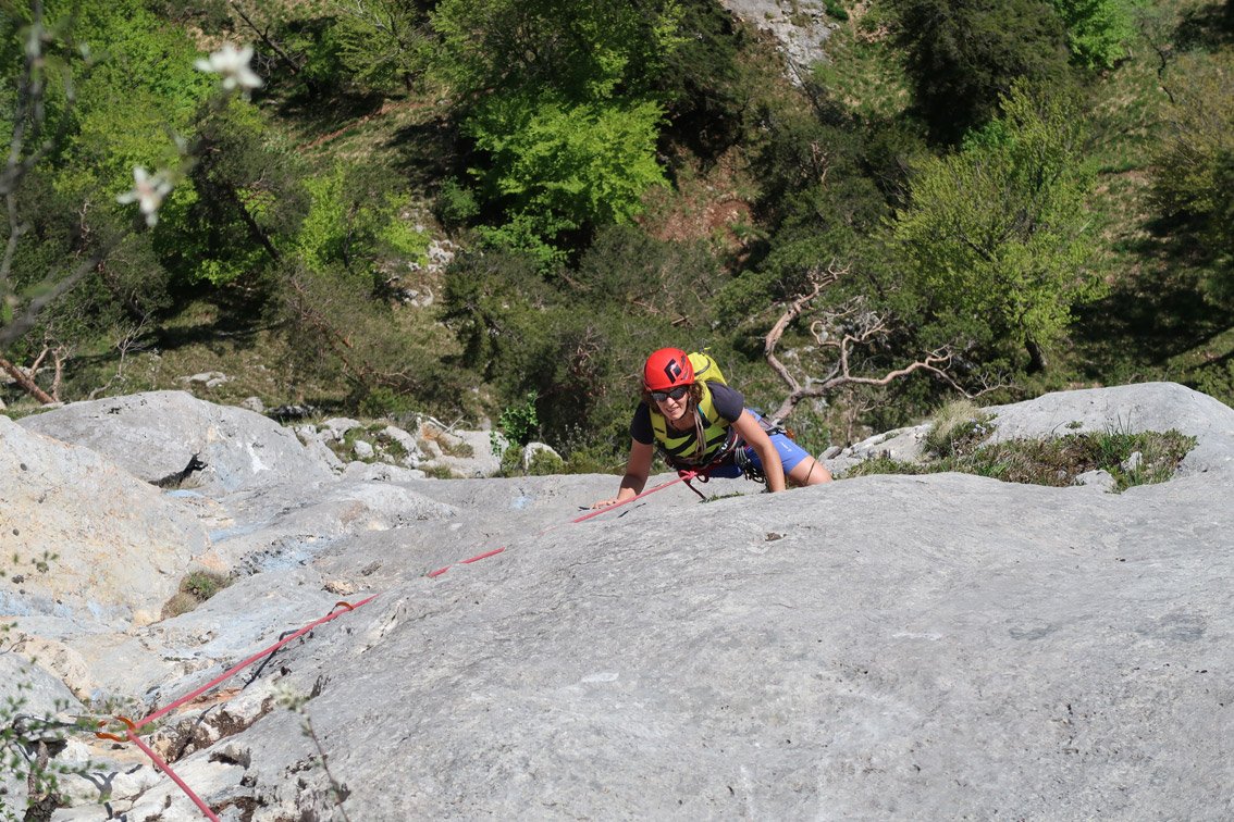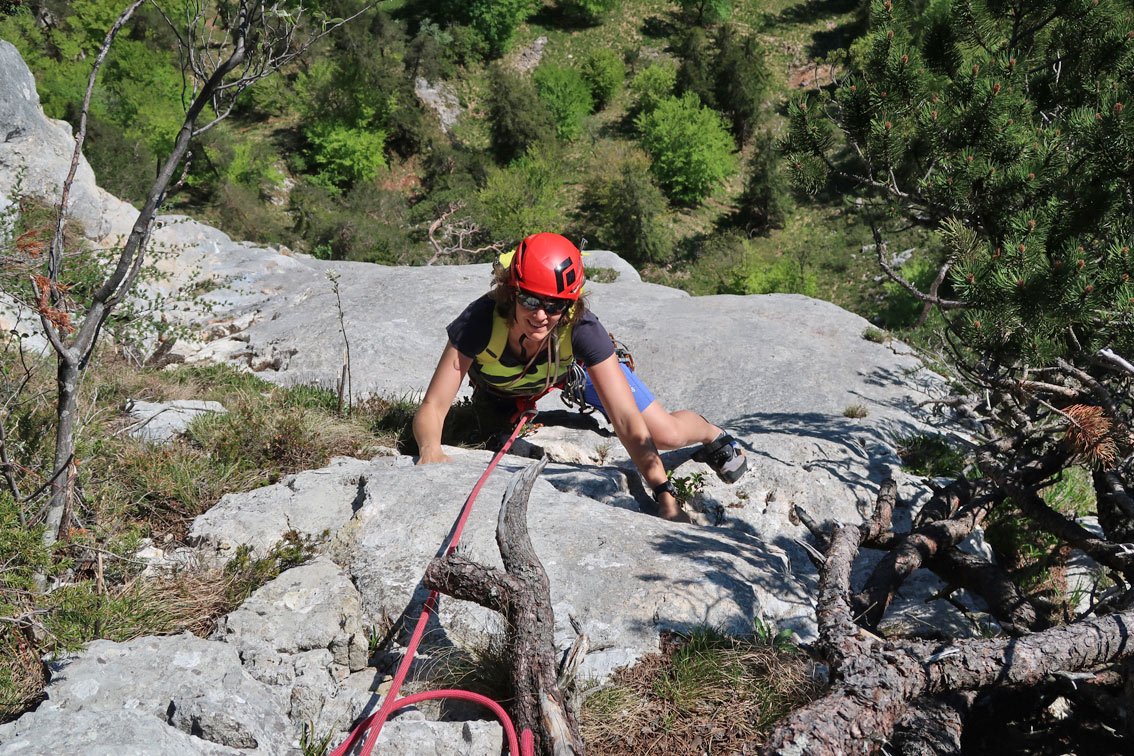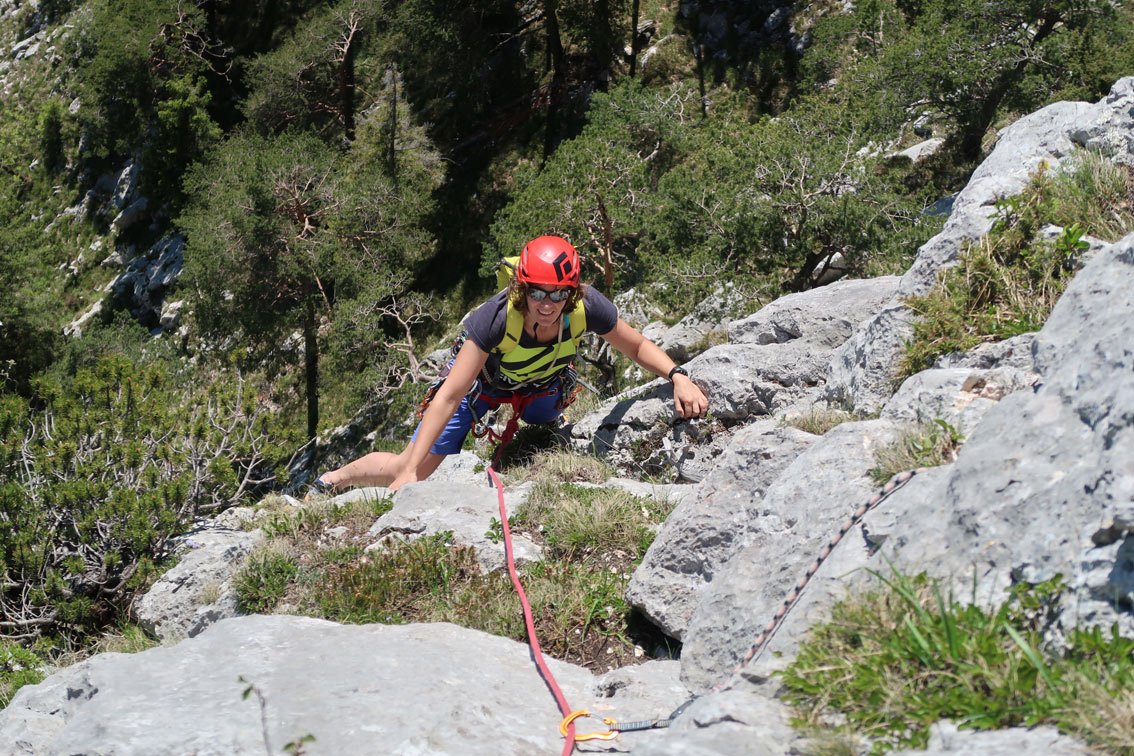 1 x 60 m Einfachseil, 14 Expressschlingen, Kletterausrüstung und Helm.