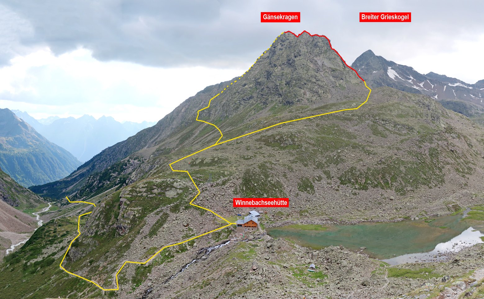 Vom Gipfel auf dem gut markierten Normalweg (Trittsicherheit ist nötig!) zurück zur Winnebachseehütte und von dieser auf dem Wanderweg retour ins Tal.