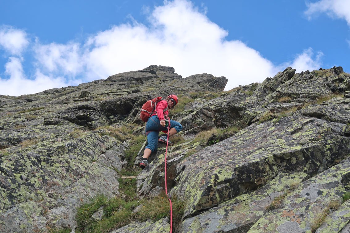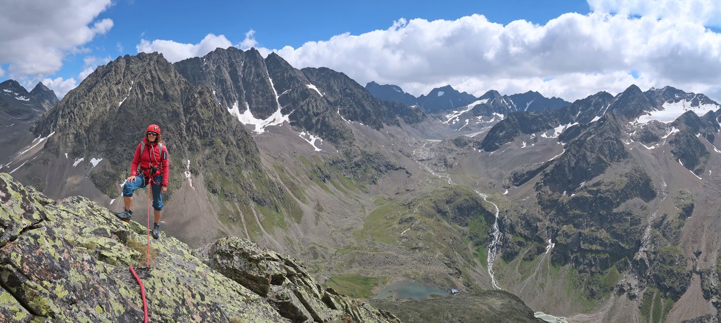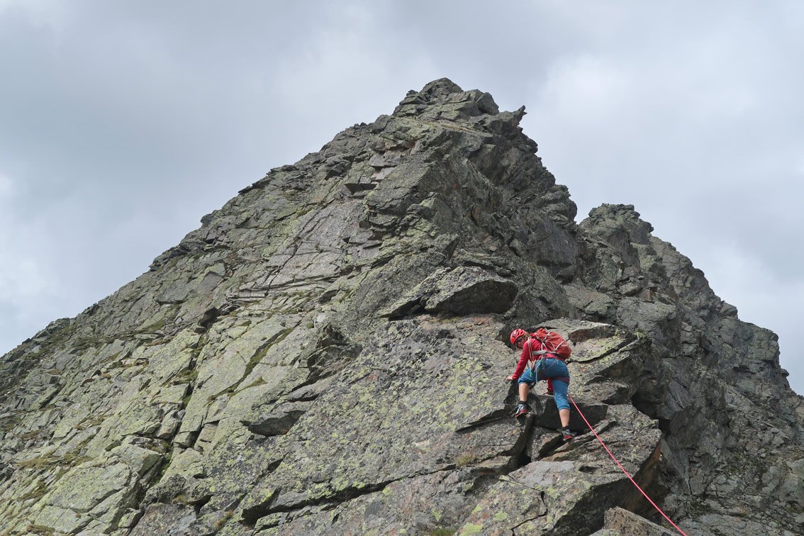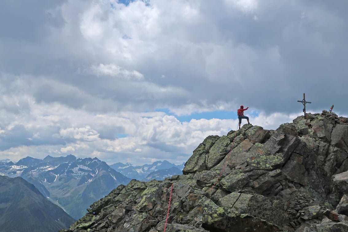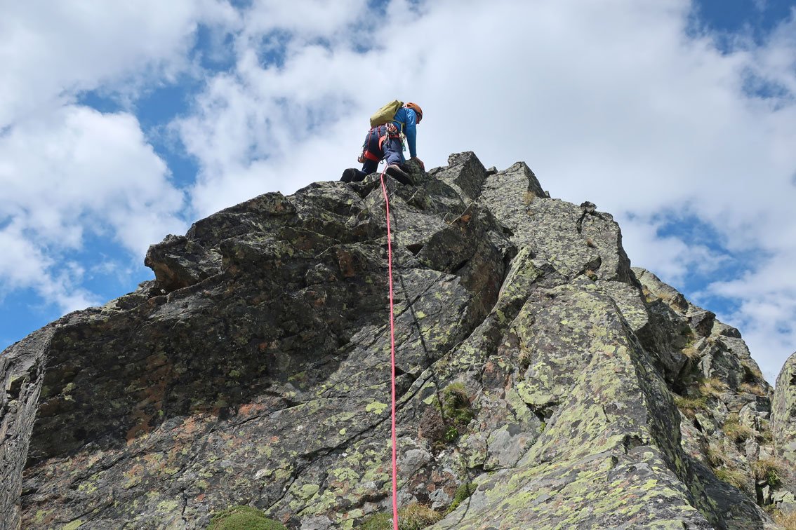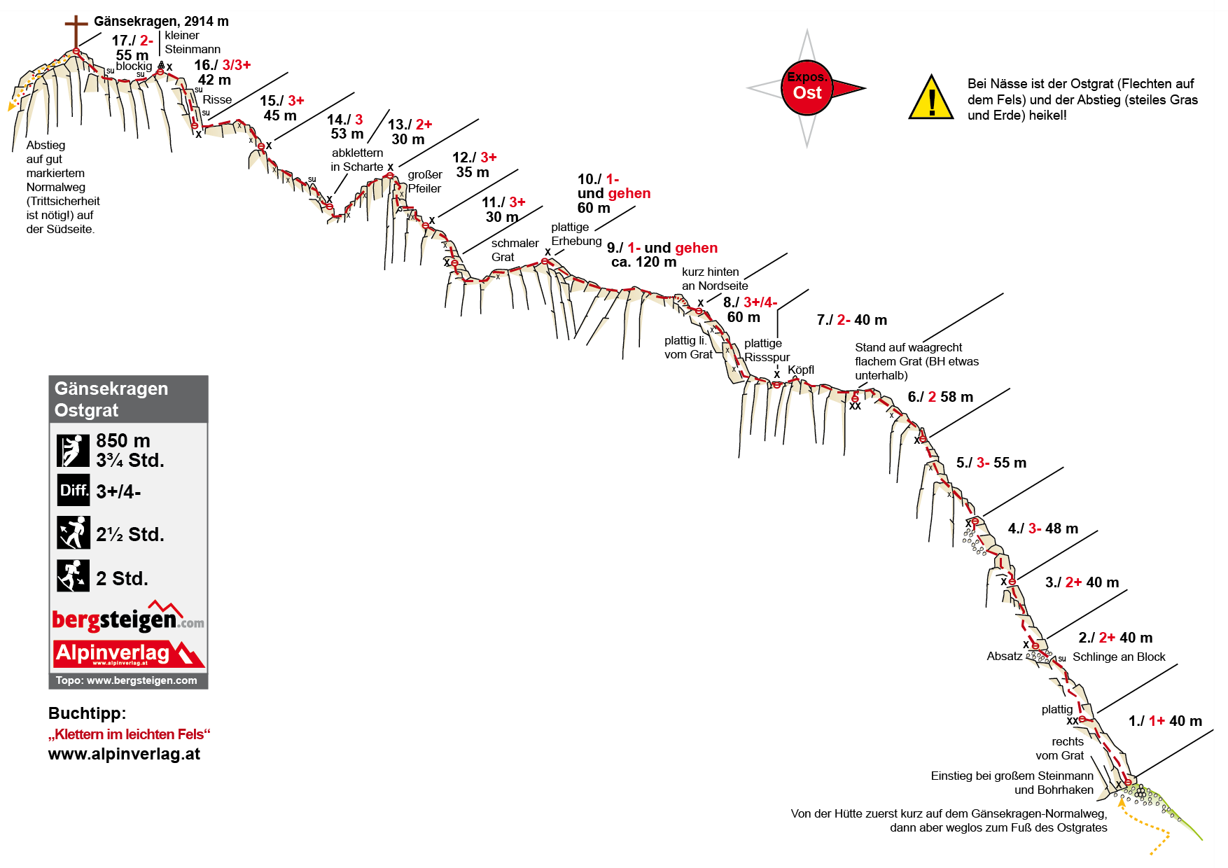 Tolle, nicht allzu schwere Gratkletterei auf den Gänsekragen. Der Ostgrat ist an den Ständen und schweren Passagen mit Bohrhaken gesichert, so macht das Klettern Spaß und man kann auch der schönen Szenerie der Ötztaler- und Stubaier Alpen Beachtung schenken. Man steigt immer im Bereich des Grates höher, Platten, Blöcke und flache Gratpassagen wechseln einander ab und am Ende steht man auf dem 2914 m hohen Gänsekragen. Perfekte Tour um ins alpine Klettern einzusteigen, die schöne Landschaft und die nette Hütte runden den Klettertag formschön ab.