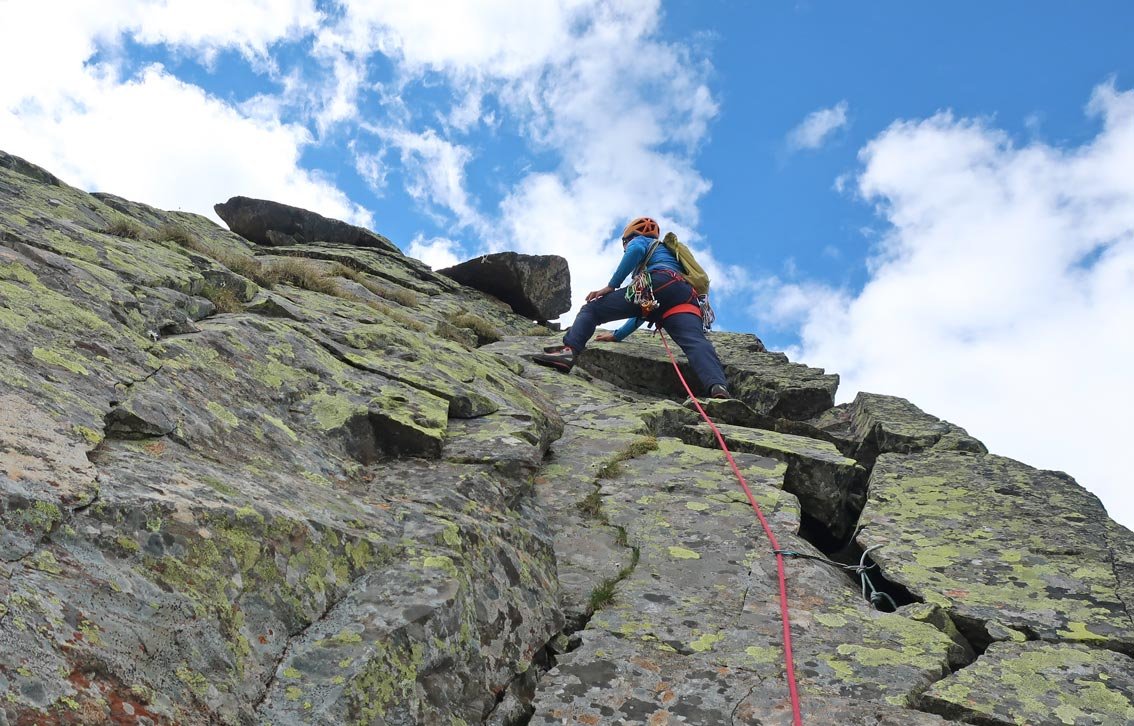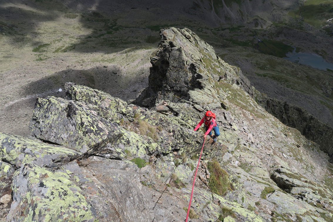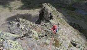 Für einen Grat im Hochgebirge eigentlich recht gut gesichert - im unteren dritten Grat sollte man aber solide (keine Haken) unterwegs sein. Bei Bedarf kann man aber mit Keilen und kleinen bis mittleren Friends die Absicherung verbessern.