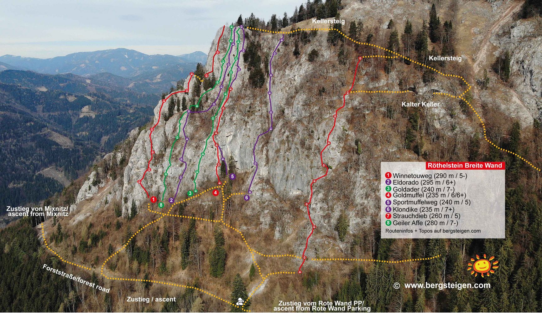 Vom Parkplatz an seinem hinteren Ende auf kleinem Weg (Schranken) anfangs fallend, an einer schönen Lichtung mit kleiner Hütte vorbei bis man unterhalb eines Jagdhauses eine breite Forststraße betritt. Dieser bergauf einige Minuten folgend zum Waldrand, hier links in den Wald auf eine Kuppe zu dreifacher Weggabelung bei einem Gatter. Auf der fallenden Wegseite (Markierung Richtung Mixnitz) weiter bis man wiederum eine Forststraße erreicht und dieser bergauf (rechts) folgt, bis sie nach einigen Minuten eben wird. Weiter auf ihr bis fast zu ihrem Ende, und hier rechts steil auf kleinem Steig (Steinmann am Beginn) zum Wandfuß aufwärts - der Steig ist in schlechtem Zustand und tw. recht zugewachsen. Rechts der Wand entlang bis zu einer markanten Platte mit der schwachen Aufschrift Eldorado (50 min). Ca. 30 Meter weiter und etwas tiefer beginnt die Route bei einer Platte mit zwei SUs und einem Bolt darüber.