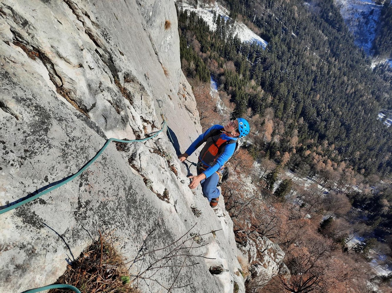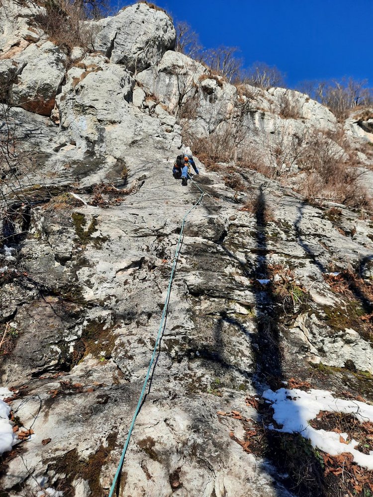 1SL: Den SU folgend und in einer Linksschleife (hier etwas brüchig und Runout) zu einer kleinen Pfeilerkante, links der Kante empor und unschwierig zum Stand. 30m 5+