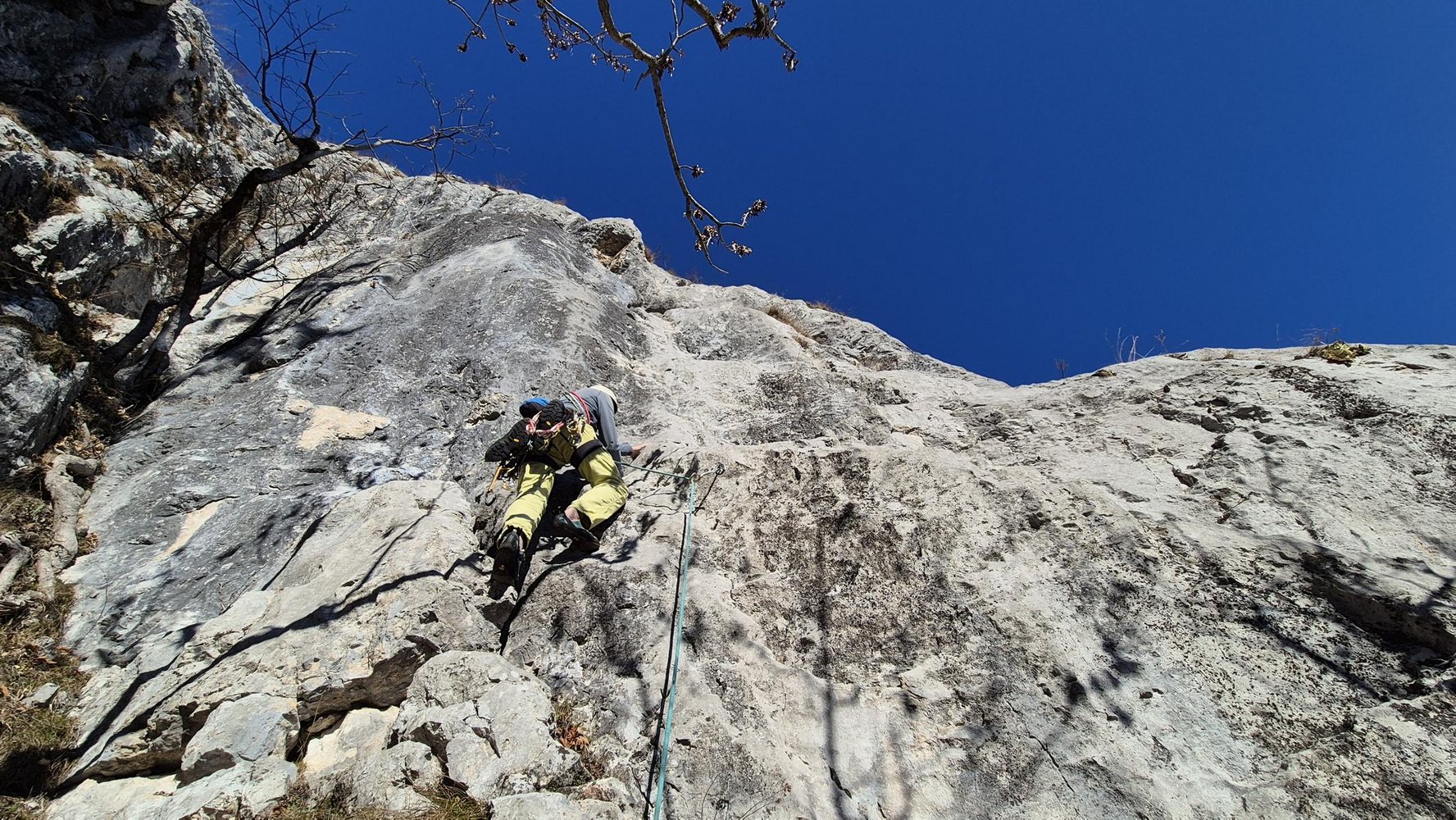 5SL: Den Gratrücken bis zu einem Querband empor und danach den SU rechts leicht steigend bis zu Stand bei steilen Wand folgen. 50m 3