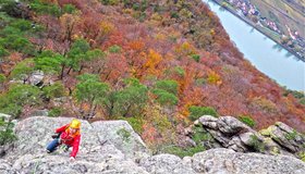 Der St. Lorenzener Genussgrat ist eine schöne und klassische Plaisirtour, die auf 18 Seillängen einem Grat am südlichen Donauufer folgt. Die Kletterei ist deutlich leichter als der Wachauergart bei Dürnstein und sehr gut mit Bolts und in den Fels gebohrten Sanduhren abgesichert. Zwischen den Felsen muss man, wie in der Wachau üblich, aber immer wieder etwas gehen und sich auch 1x kurz abseilen. Der Fels ist stellenweise etwas mit Flechten überzogen, es sollte daher trocken sein.