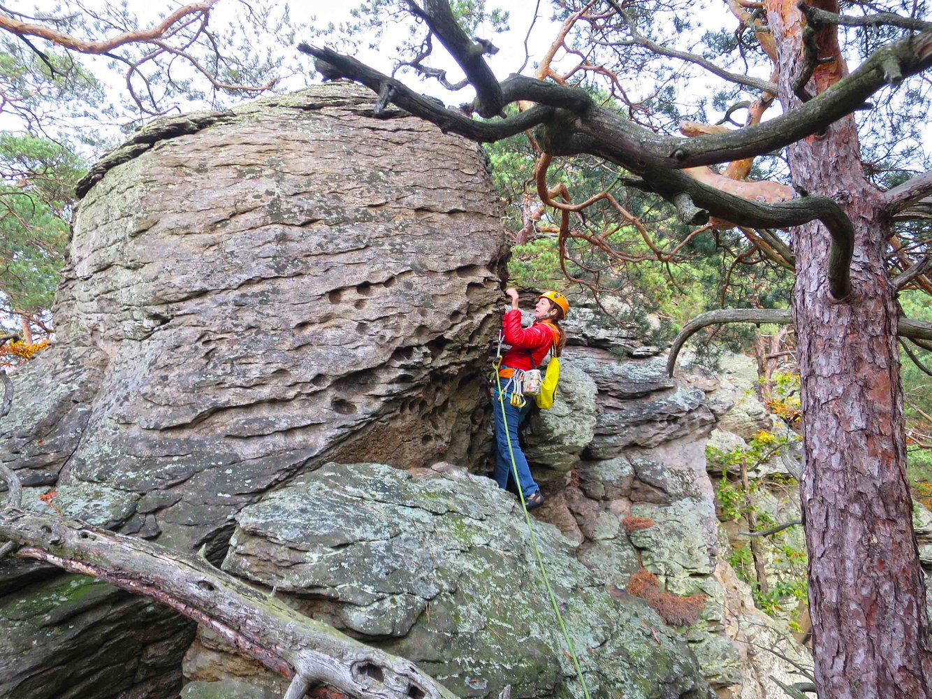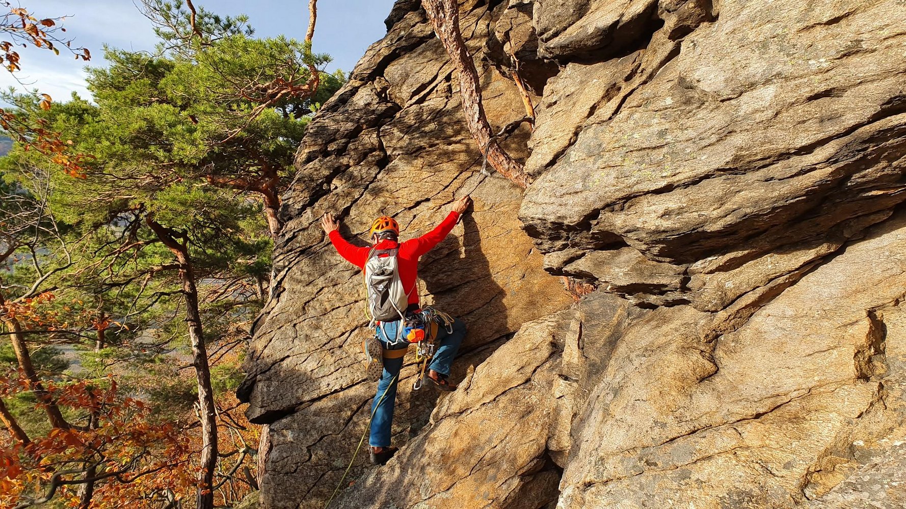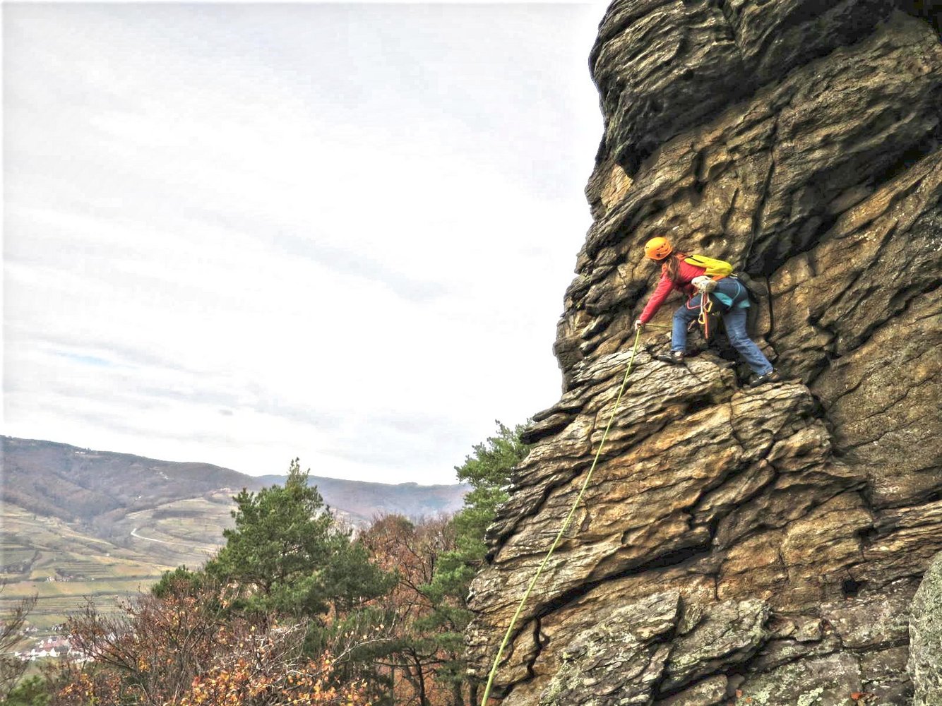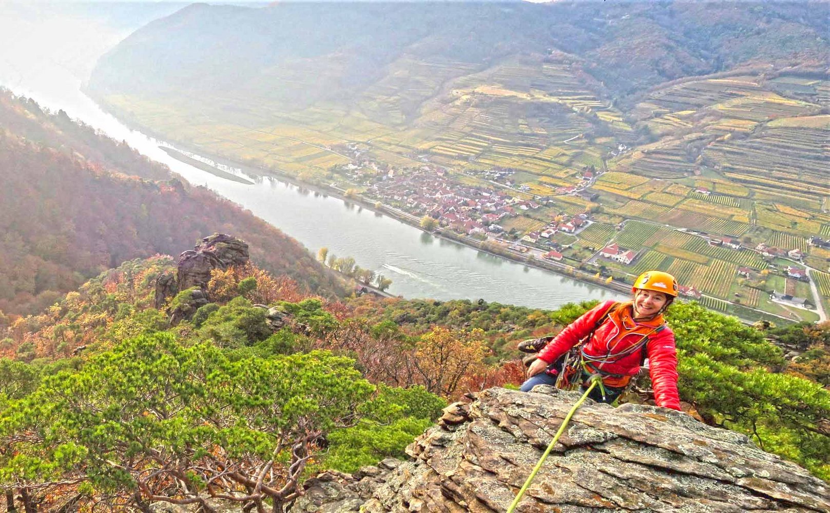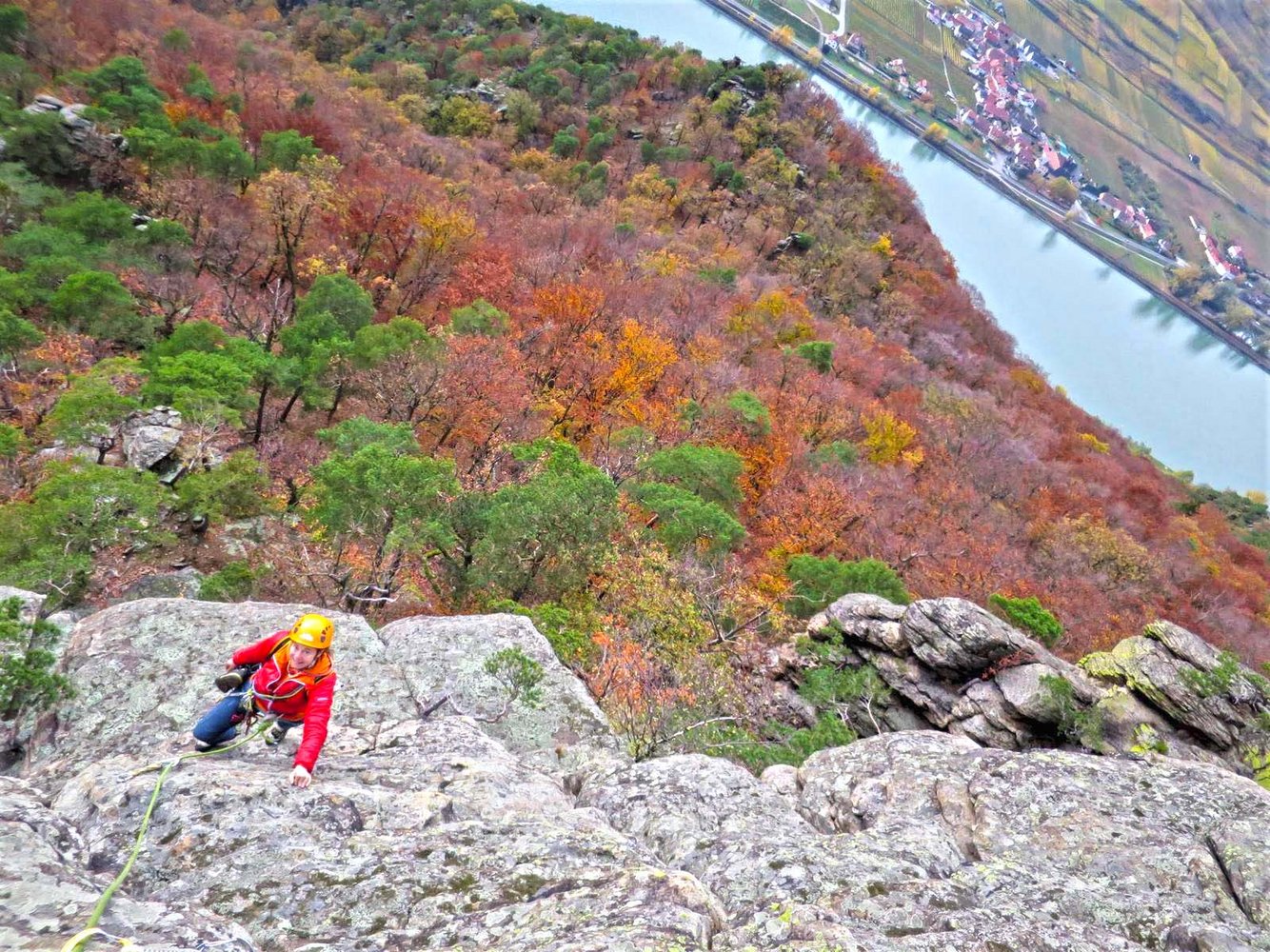 Der St. Lorenzener Genussgrat ist eine schöne und klassische Plaisirtour, die auf 18 Seillängen einem Grat am südlichen Donauufer folgt. Die Kletterei ist deutlich leichter als der Wachauergart bei Dürnstein und sehr gut mit Bolts und in den Fels gebohrten Sanduhren abgesichert. Zwischen den Felsen muss man, wie in der Wachau üblich, aber immer wieder etwas gehen und sich auch 1x kurz abseilen. Der Fels ist stellenweise etwas mit Flechten überzogen, es sollte daher trocken sein.