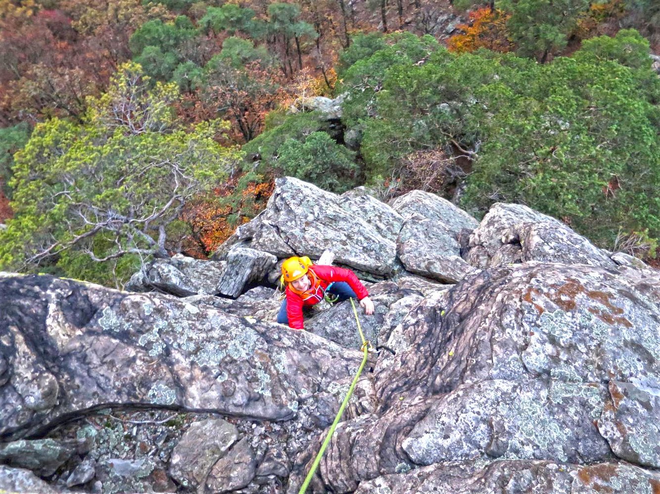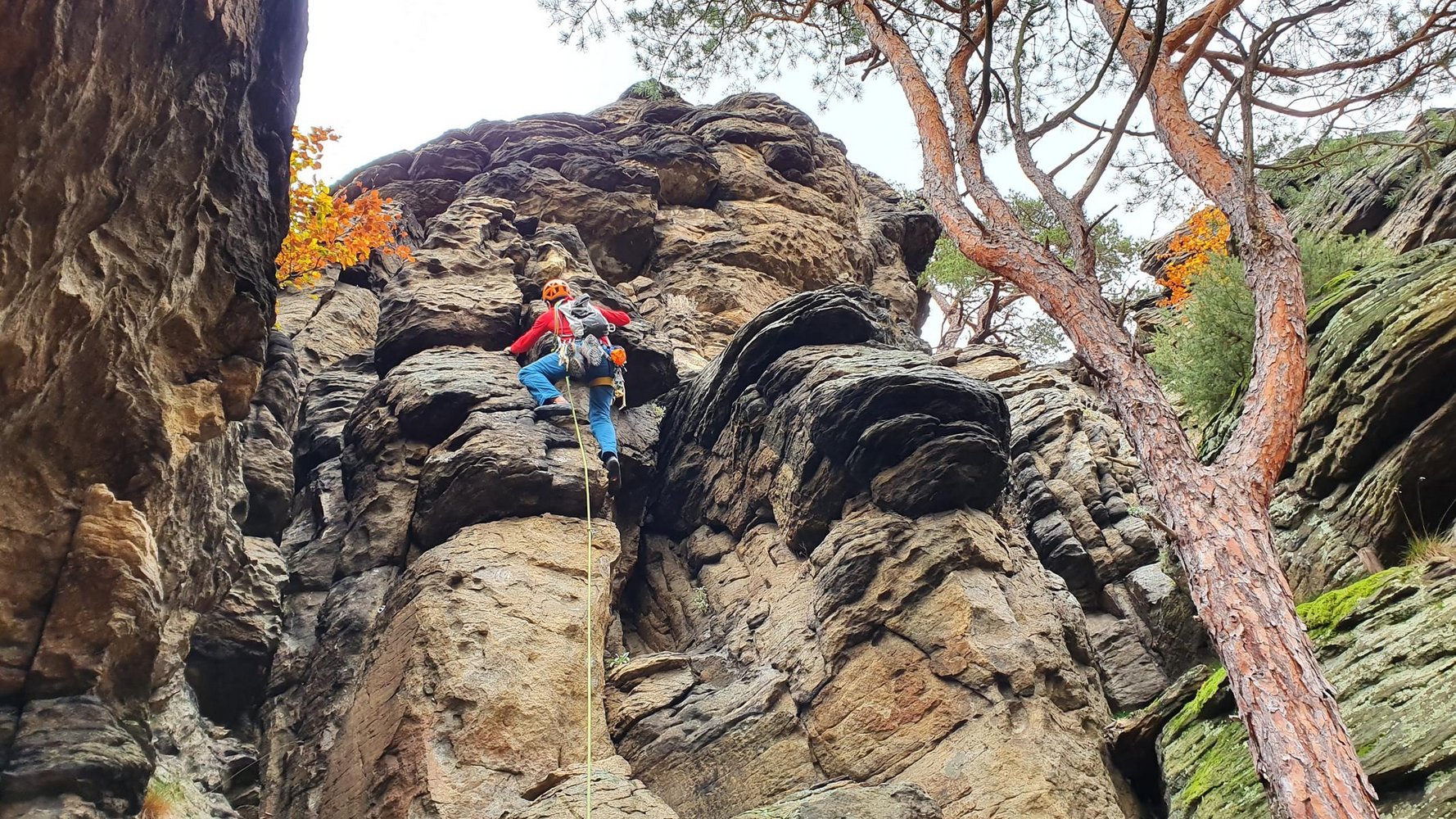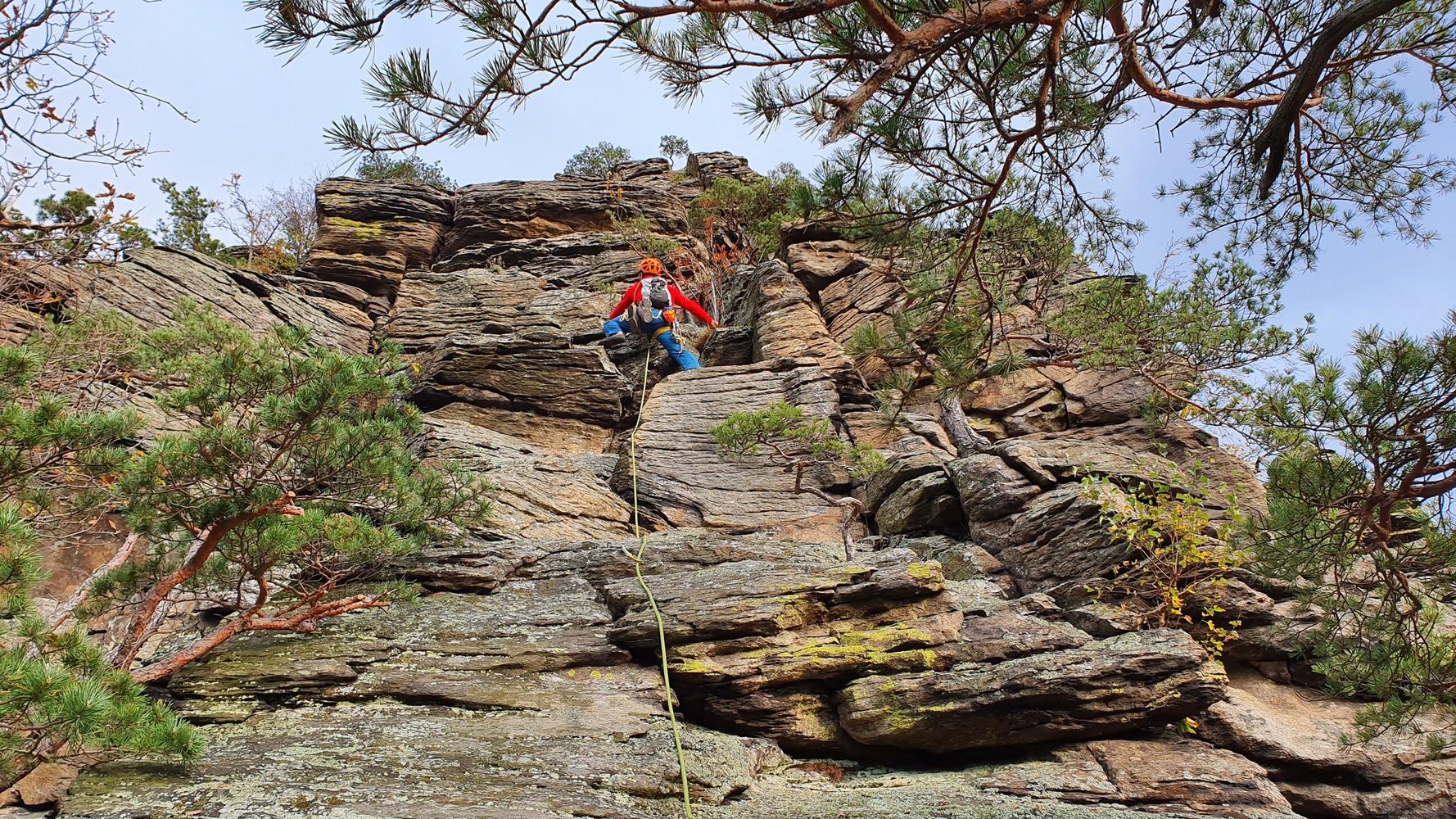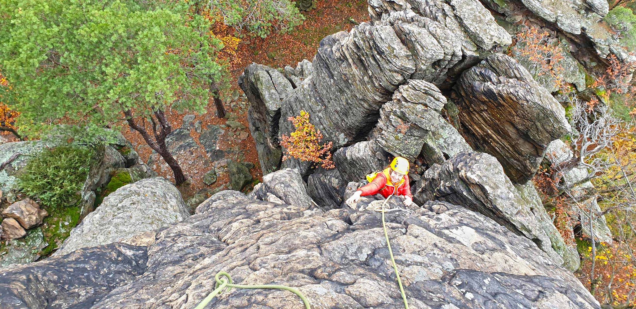 50 m Seil (40 reicht auch), 10 Express und Schlingen für die Stände an Bäumen. Keile und Friends braucht man nicht, können aber sehr gut zusätzlich gelegt werden.