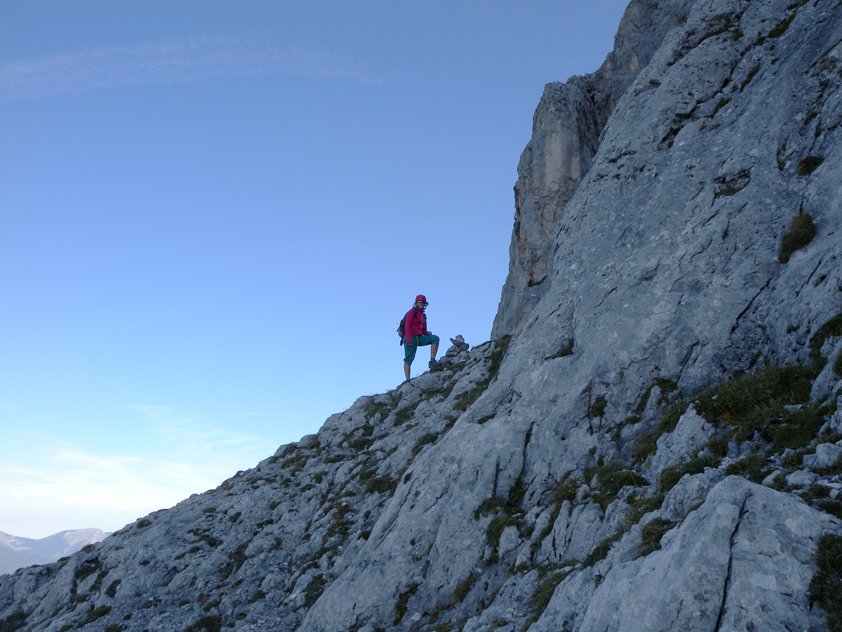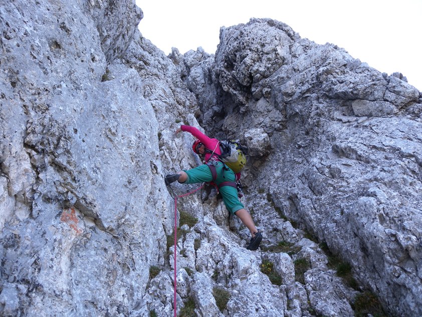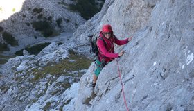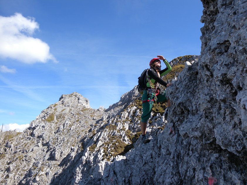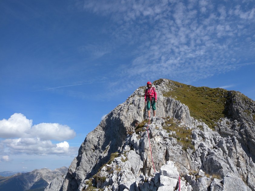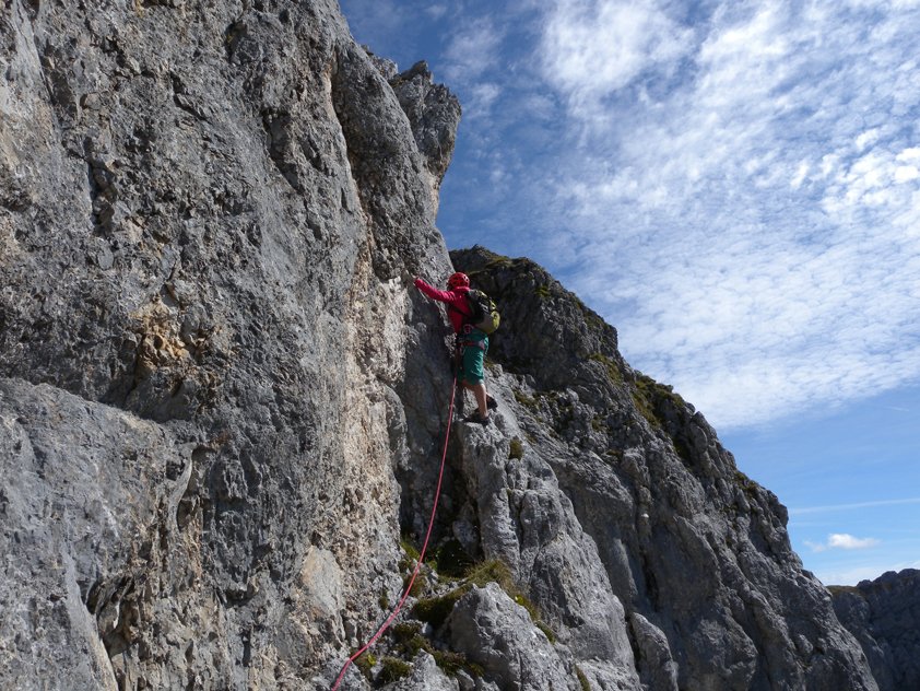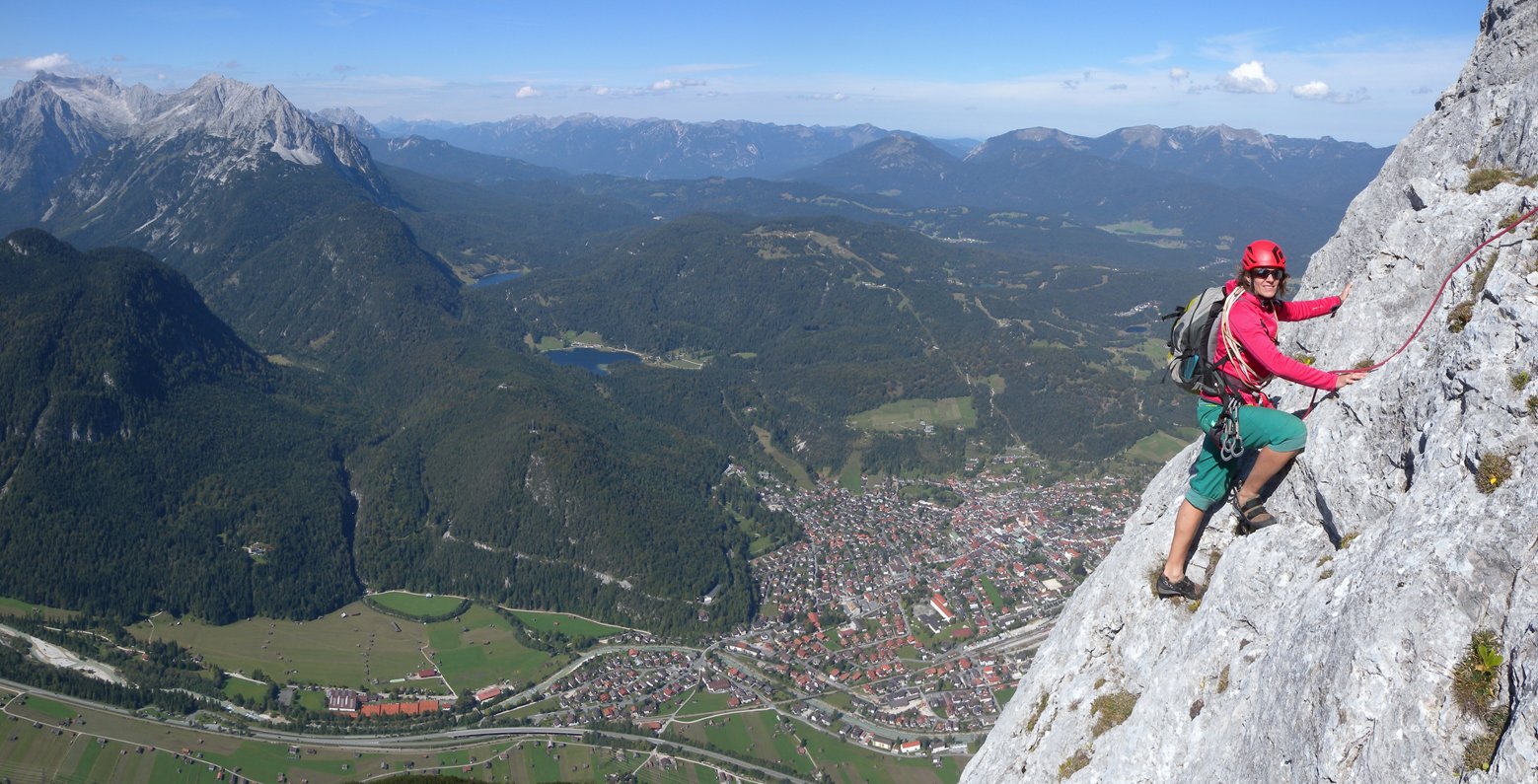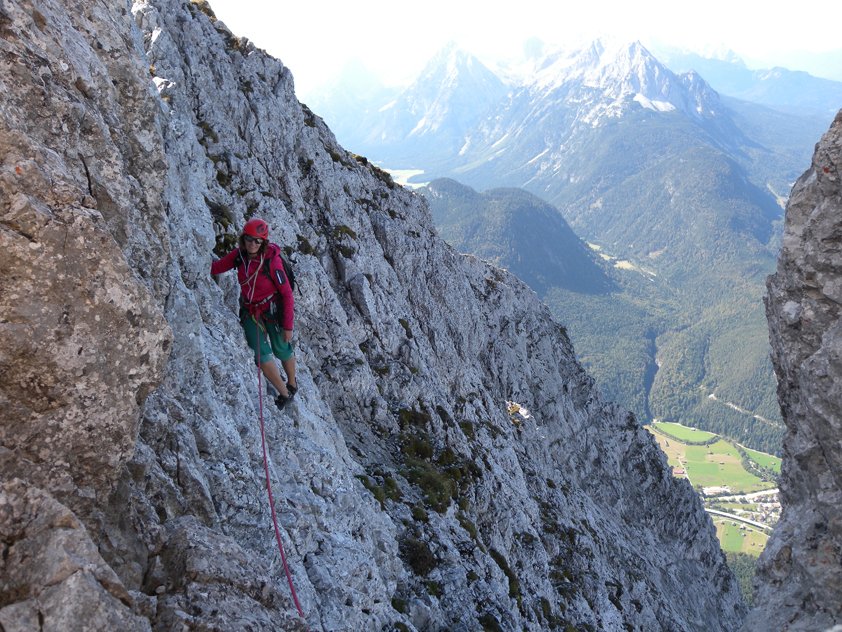 Schöne, lange und an den leichten Passagen alpine Kletterei auf das Gerberkreuz hoch oberhalb von Mittenwald. Die schöne Kletterei führt auf einen markanten Gipfel, von dem man dann weiter zum Mittenwalder Höhenweg aufsteigt. Die Kletterei an den schweren Passagen ist sehr schön, im oberen Teil ab dem Vorgipfel gibt es aber auch viel alpines Schrofengelände. Gesamt eine tolles Kletterabenteuer an den Westausläufern des Karwendels.
