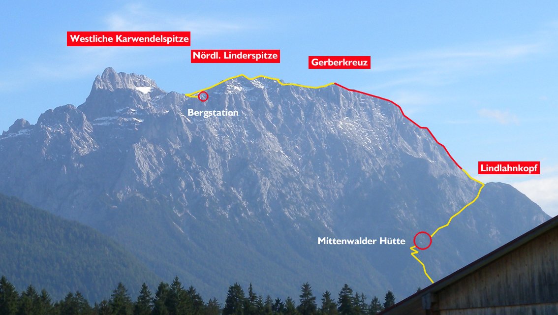 Vom Gipfel des Gerberkreuzes folgt man dem Grat. Die ersten Gratzacken umgeht man rechts, man steigt zu einer kl. Scharte bei einer Rinne ab. Dort aber gleich rechts wieder im anfangs steilen Gras zurück auf den Gratkamm (nicht die Rinne weiter runter). Man geht zu einer schon sichtbaren großen Steilstufe, dort ein paar Schritte links runter, dann aber gleich auf Steigspuren zur ersten Kletterstelle (2) queren (oben sieht man rosa Punktmarkierung). Über die Stufe hinauf, dann weiter den Steigspuren etwas nach links folgen. An einer Kante noch einmal kraxeln (2-, rosa Punktmarkierung), dann den Steigspuren bis zum Mittenwalder Höhenweg folgen, auf diesem nach links zur Karwendelbahn.