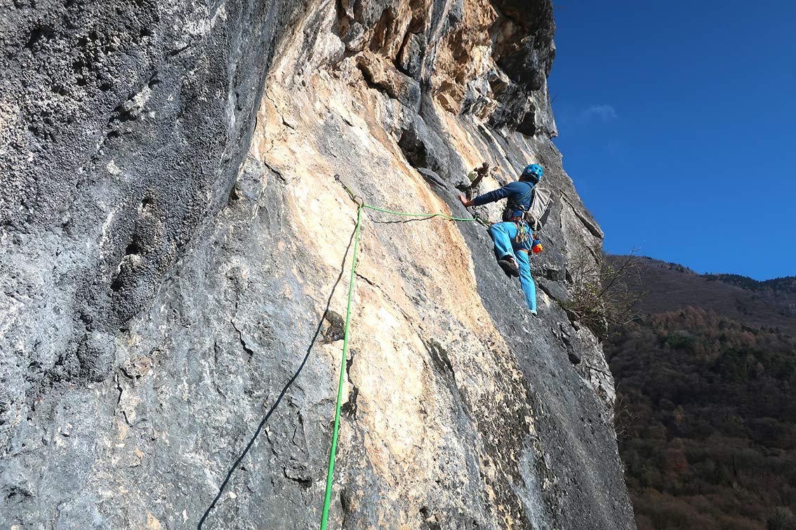 Die Route ist im Kluckner/Grill Stil (aber mit etwas mehr Bohrhaken) recht gut abgesichert.
