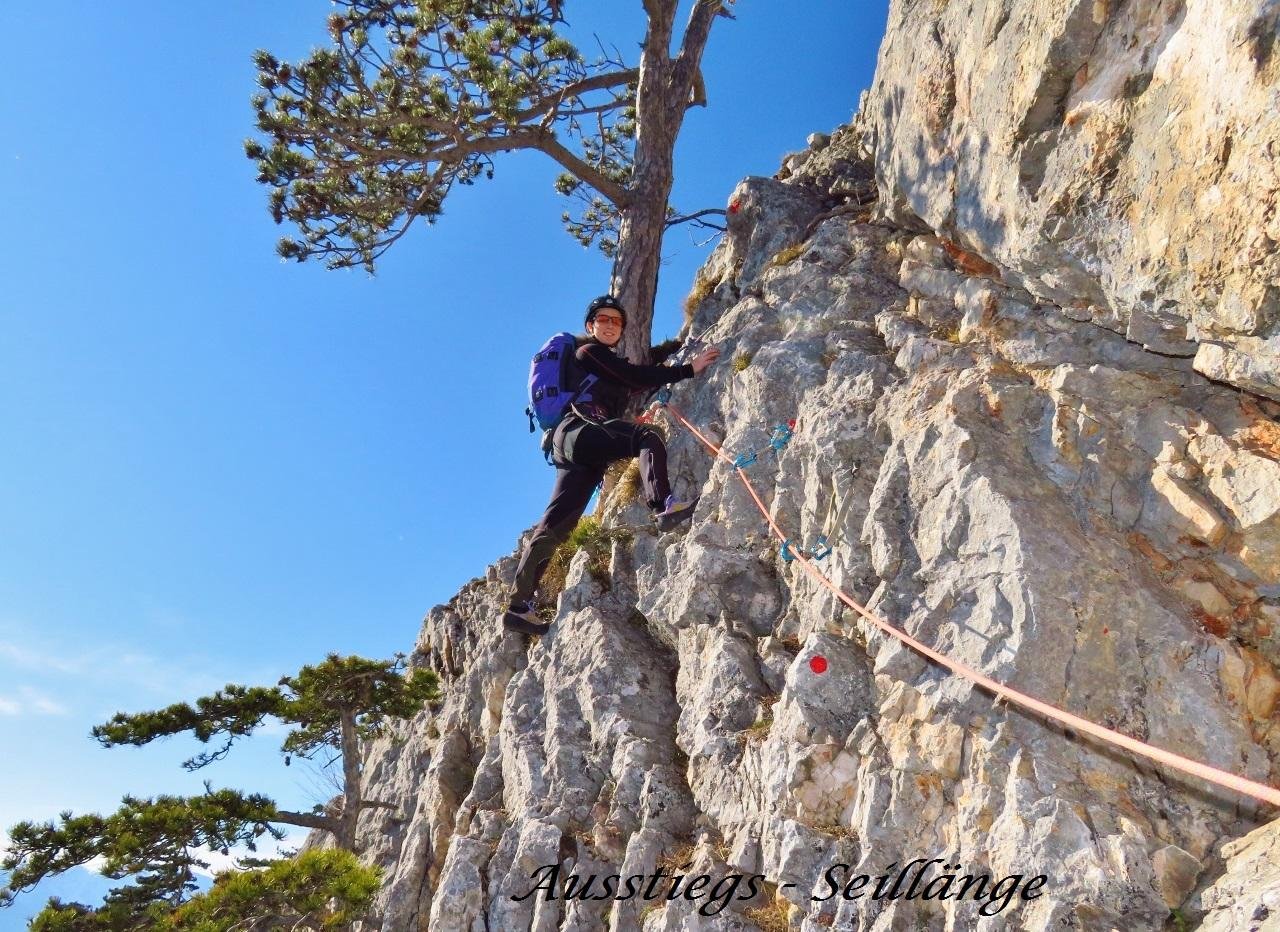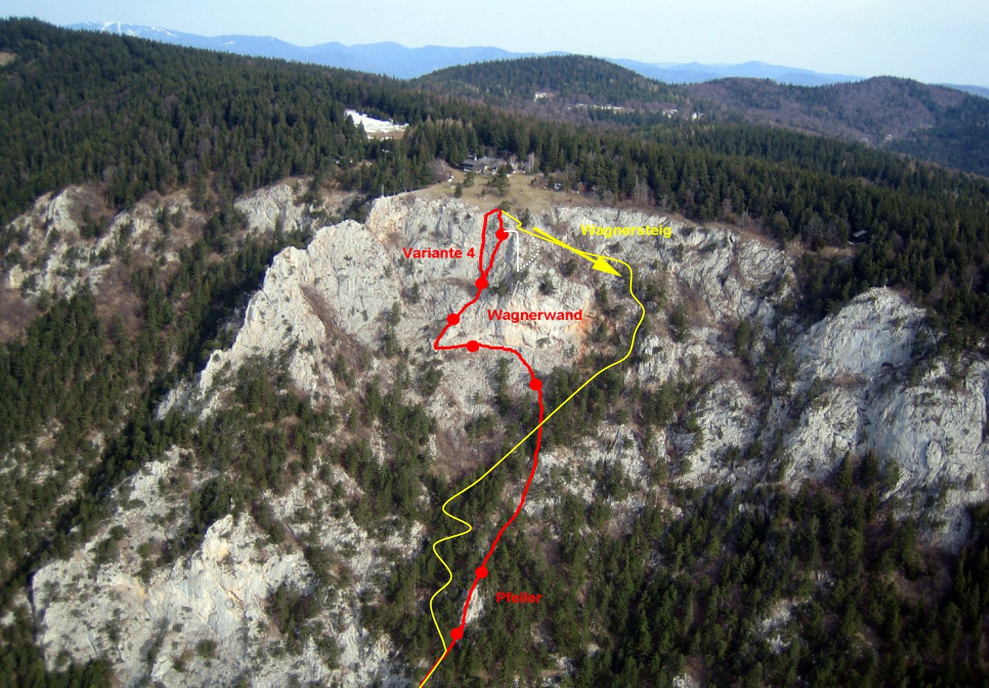 1. SL: Über eine steile Platte in eine kurze Verschneidung mit Bäumchen. Dann netter Felsgrat, bis dieser flach ausläuft (in der Nähe des Wagnersteiges). Dort horizontal nach links (Pfeil) zu Stand bei Baum. 40 m, 3 und 2. 2. SL: Gemeinsam mit dem Eichertsteig: Schräg links über eine Plattenrampe empor zum Wiesenrand (Ausstieg des Wagnersteiges, BH-Stand etwas links davon). 15 m, 2.