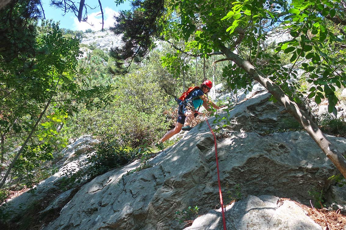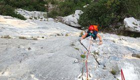 Die Tour ist sehr gut abgesichert, die Schlüsselstellen kann man technisch klettern. Im unteren Teil leider viel Schrofenkletterei.