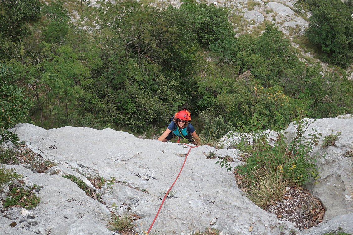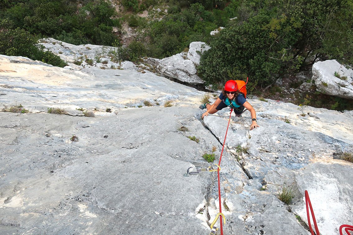 60 m Einfachseil, Helm, 14 Expressschlingen und einige Bandschlingen.