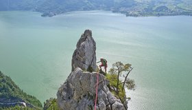 Wasser und steile Felswände, diese Kombination ist immer etwas Besonderes und so verwundert es kaum, dass der Traunstein SW-Grat zu den großen Klassikern in Oberösterreich gehört. Die Tour ist genial, man klettert immer sehr luftig und ausgesetzt entlang des Grates aufwärts. Die Kletterei ist aber nie besonders schwer, alle Stellen lassen sich einfach bewältigen. In Kombination mit dem Gmundnerweg kommt eine lange, tagesfüllende Klettertour zustande, bei der man immer tolle Ausblicke auf den Traunsee hat. Im Sommer lockt vor allem die Badeund Klettermöglichkeit. Direkt beim Parkplatz gibt es einen Badeplatz, an dem man nach der Tour seine müden Knochen genüsslich in der Sonne rekeln kann.