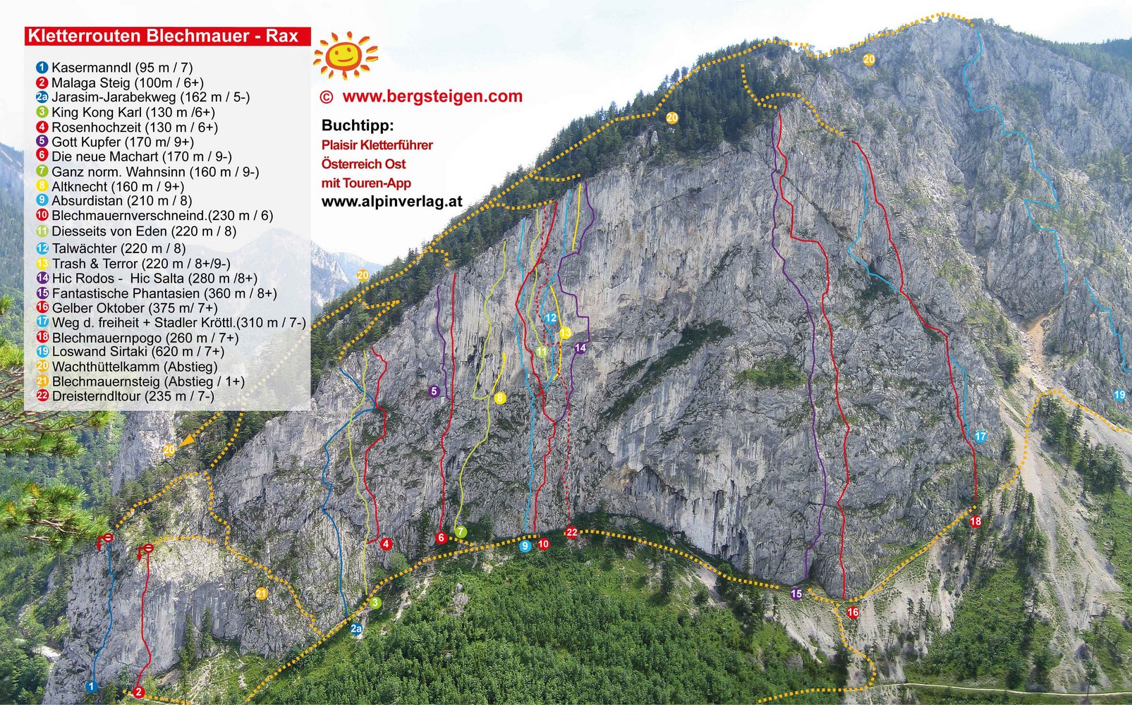 Man steigt vom Ausstieg bergseitig aufwärts, bis vom Ausstieg der Blechmauernverschneidung ein Weg nach links zum Wachthüttelkamm (tw. versichert) führt. Diesen hinunter bis zum Parkplatz. Alternativ kann vom Wachthüttelkamm aus der Blechmauernsteig benützt werden (1+, tw. rot bezeichnet), der zurück zum Wandfuß führt.