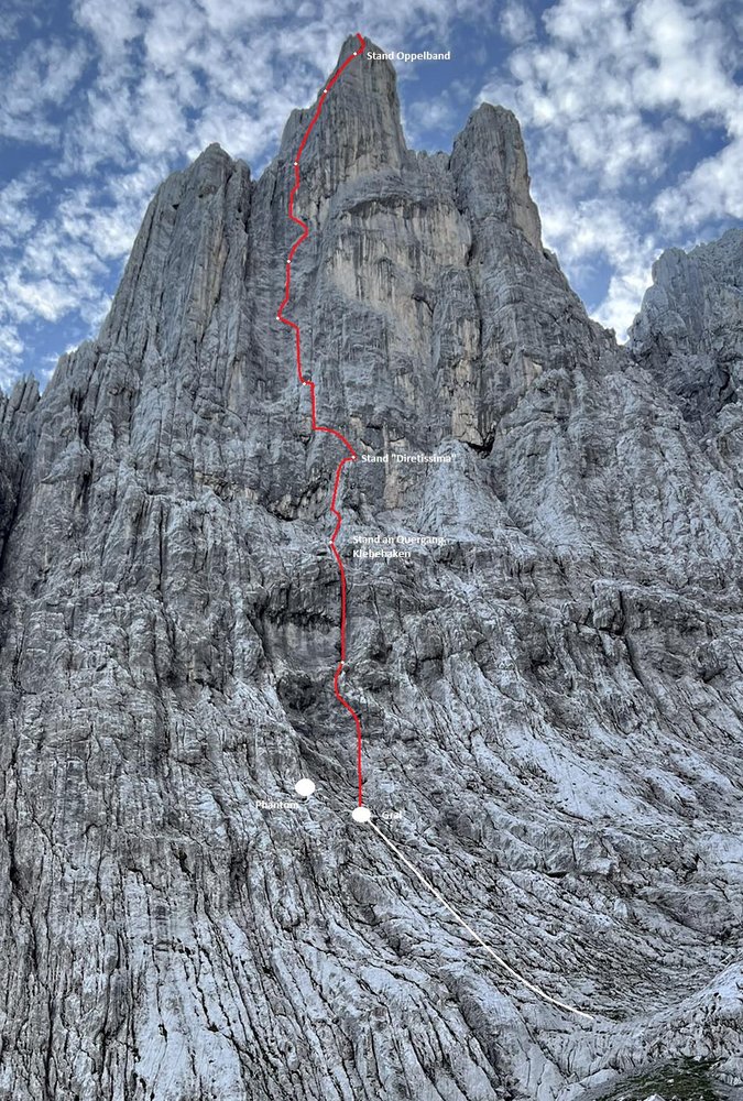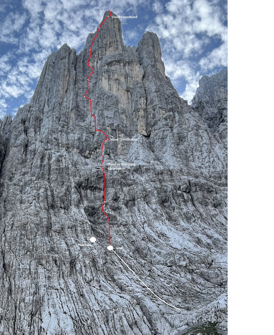 Abseilen über die Tour ist möglich, aber nicht empfehlenswert. Besser Abstieg zum Botzongkamin und durch diesen abseilen, dann Abstieg zum Wandfuß.