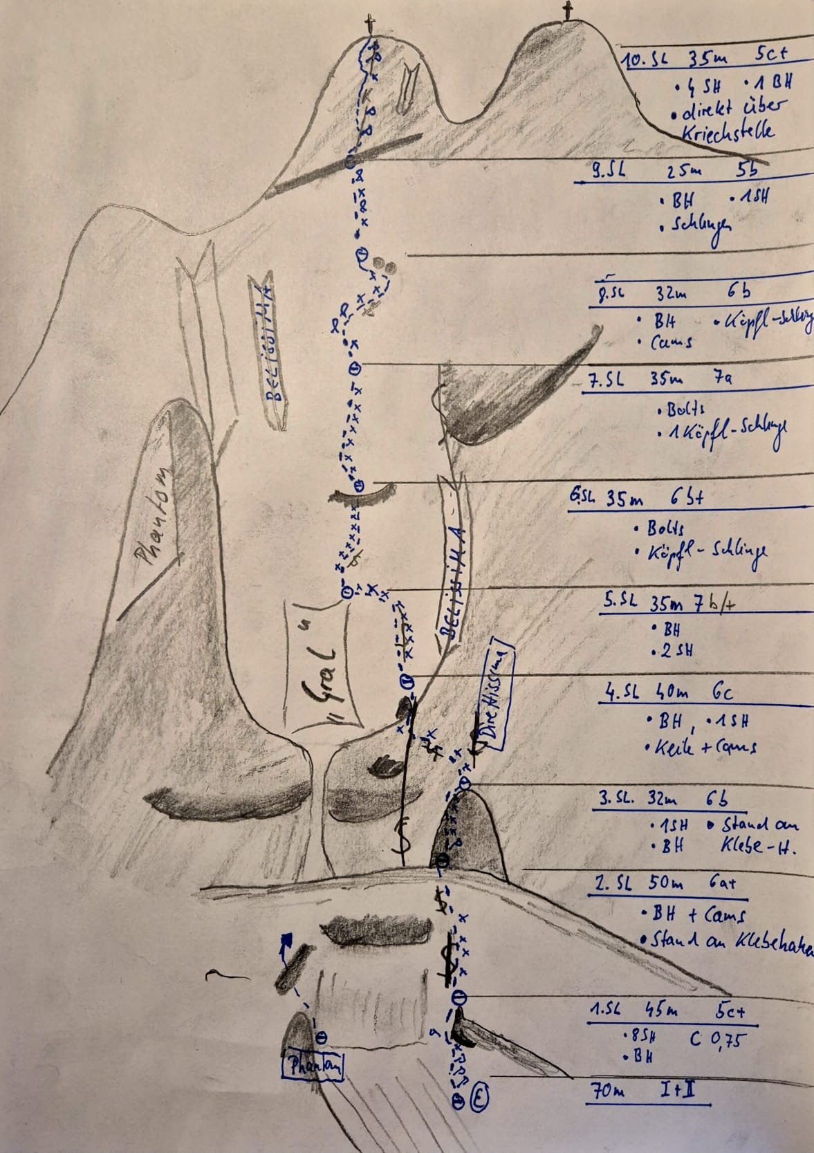 Der Einstieg befindet sich etwa 10-15 m rechts der Route "Phantom", etwa 70 m oberhalb des Wandfußes in leichtem Schrofengelände und in Falllinie der großen, plattigen "kelchartigen" Mulde in der Predigtstuhl-Westwand. Bei der Orientierung hilft ein etwa 15x15 m großes, plattiges Quadrat. An dessen unterer, rechter Ecke befindet sich der Standplatz der ersten Seillänge (siehe Übersicht). Die Schlüsselseillänge (9-/8-A0) ist gleich zu Beginn der kelchartigen Mulde ("Gral" - fünfte Seillänge). Danach wird es zunächst leichter, bis die steile siebte Seillänge (8) nochmal Kraft und Ausdauer verlangt. Danach wird es wieder leichter, bis schließlich die letzte Seillänge in einem grandiosem, gutgriffigem Finale - direkt über dem Stand des berühmten "Oppelbandes" - endet.