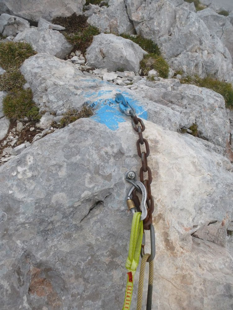 Abseilen über Abseilpiste (4 mal 30m; siehe Topo) oder über Klettersteig 'Crete Rosse' absteigen. Dann wie Aufstieg.