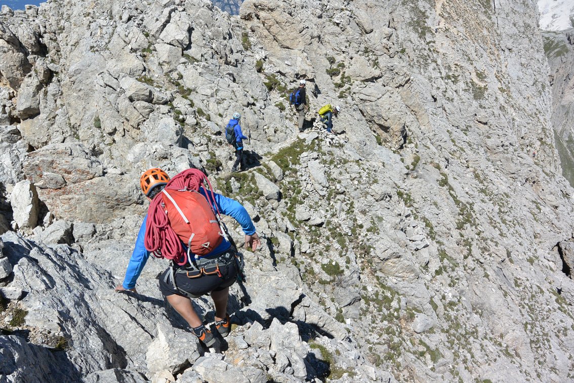 Anmerkung: Die versicherte Passage gehört zum Rotwandklettersteig, der ist oft überlaufen (Stau bei der Seilsicherung). Man kann links von den Seilsicherungen den sog. "Bergführerweg" (drei schöne Seillängen im oberen 3. Grad) klettern, der Ausstieg ist genau beim Ende des stahlseilversicherten Spaltes.