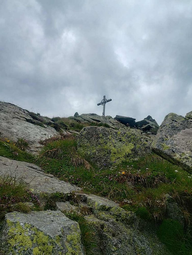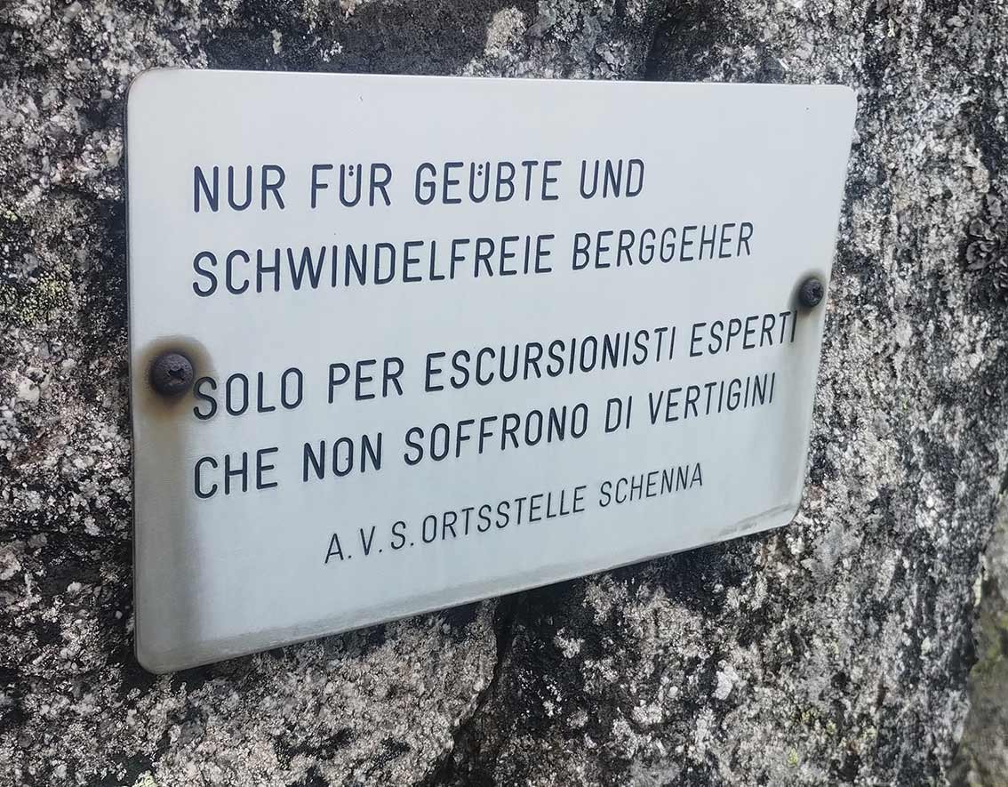 Von der Scharte über Blöcke die Rampe hinauf, dann rechts auf Platten (Stellen bis 2-, das sind die schwersten Kletterpassagen der Tour) hinauf zum Stahlseil an der Kante. Ein kurzes Klettersteigstück (A/B) und kurze Kletterpassagen 1 führen zu grasigem Gelände. Links über eine Stufe (1-) zur nächsten Klettersteigpassage (A), danach gestuft im steilen, felsdurchsetzen Gras (1-) höher. Auf einem breiten Rücke im Blockgelände aufwärts (1-) bis zu einer Stufe (1, oben steckt ein Haken). Danach quert man zu einer Kante mit rotem Pfeil (Bohrhaken). Dort dann auf Platten (1-) nach links queren, bis man in die sog. Luther-Rinne kommt. In der breiten Schuttrinne aufwärts, über eine kurze Felsstufe (1-) zu den Klettersteig-Sicherungen am linken Rinnenrand. Entlang des steilen Stahlseils (bis C) höher, dann nach links auf einem Band (A) aus der Rinne queren. Auf Pfadspuren hinauf bis man vor einer kleinen Scharte nach links über eine Stufe (1-) zum letzten Klettersteigabschnitt gelangt (Kette, B). Am Ende der Kette kurz auf dem Band nach links, dann gestuft (1-) gerade hinauf bis zum Gipfelkreuz.