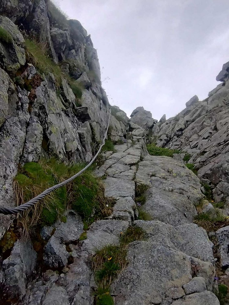 Die steilen Felspassagen sind mit einem Klettersteigseil (Stahlseil) gesichert, die leichten Passagen muss man frei klettern.