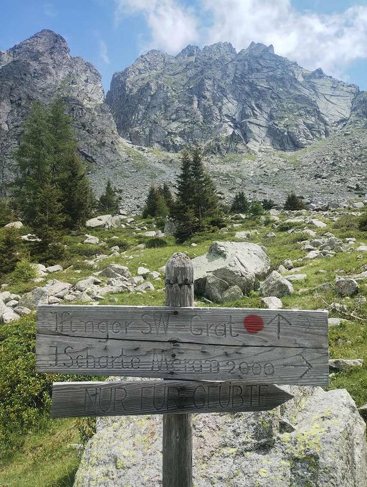 Der Südwestgrat ist gut mit roten Punkten und Richtungspfeilen markiert - Orientierungsprobleme hat man in der Regel keine.